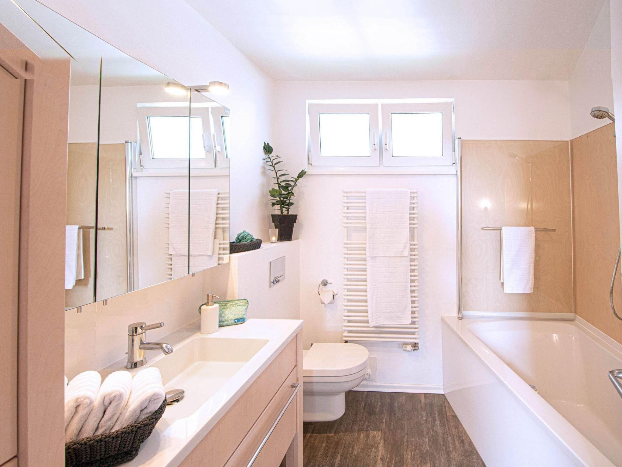 Das Badezimmer ist modern ausgestattet und verfügt über Fußbodenheizung, eine Badewanne mit integrierter Dusche, ein WC und eine Waschmaschine, was besonders für längere Aufenthalte praktisch ist.