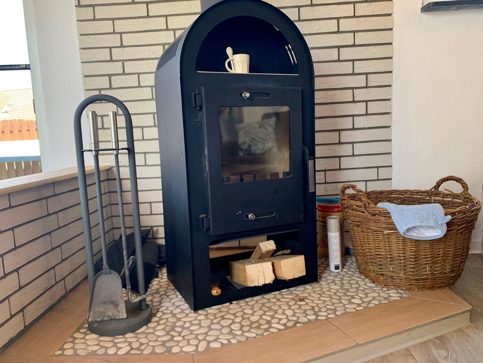 Die offene Küchenzeile ist in den Wohn- und Essbereich integriert und bietet alles Nötige für die Zubereitung leckerer Mahlzeiten. Der gemütliche Kaminofen sorgt in den kühleren Monaten für eine behagliche Atmosphäre, während eine Elektroheizung zusätzlichen Komfort bietet.