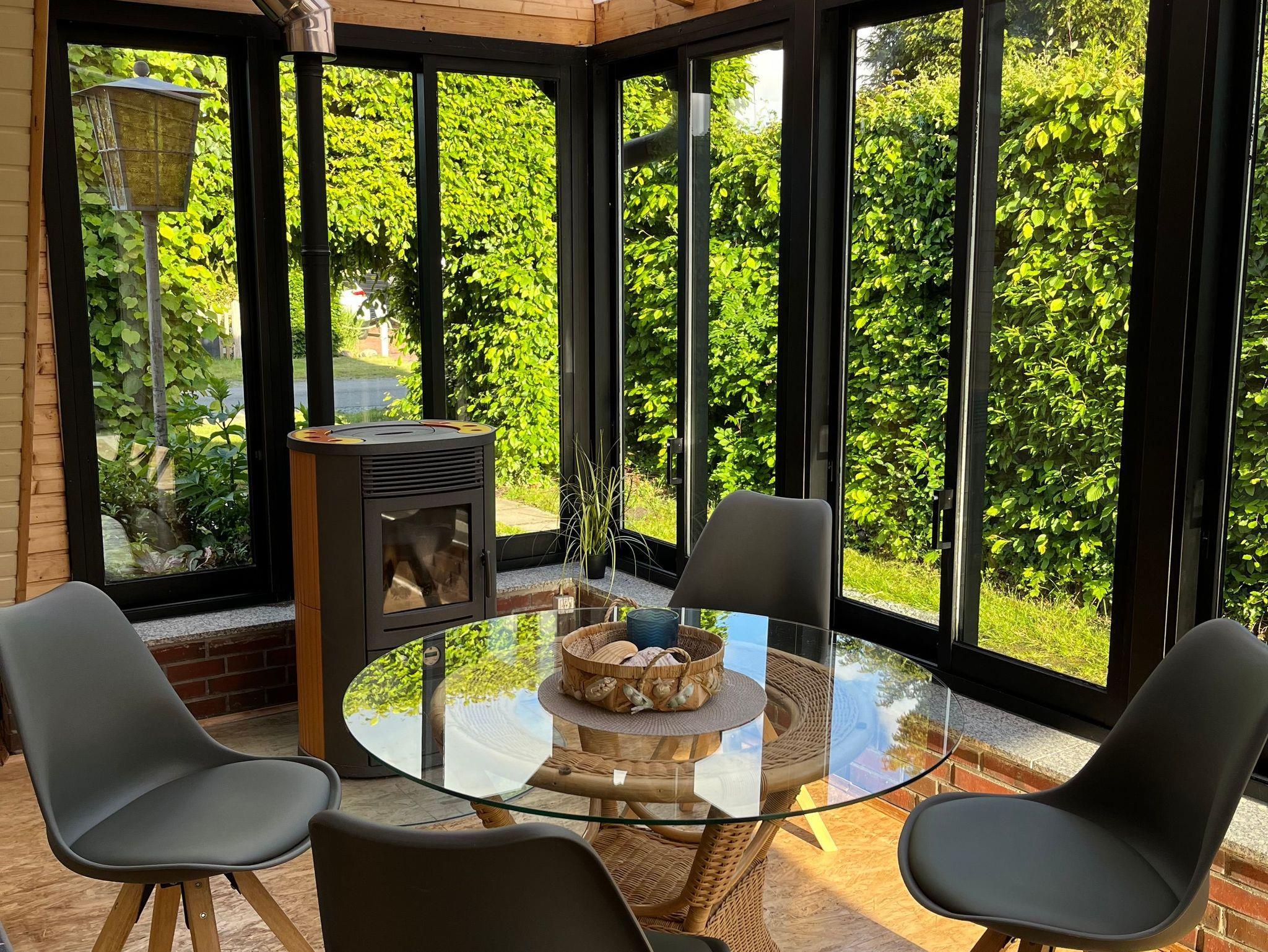 Das Haus selbst ist ansprechend eingerichtet und bietet allen Komfort, den Sie für einen erholsamen Aufenthalt benötigen. Für Familien mit Kleinkindern stehen ein Kinderbett, ein Hochstuhl sowie eine Treppenkindersicherung zur Verfügung. Im neu erbauten Wintergarten können Sie zu jeder Jahreszeit entspannen, während an kühlen Tagen ein Pellets-Kaminofen für wohlige Wärme sorgt.
