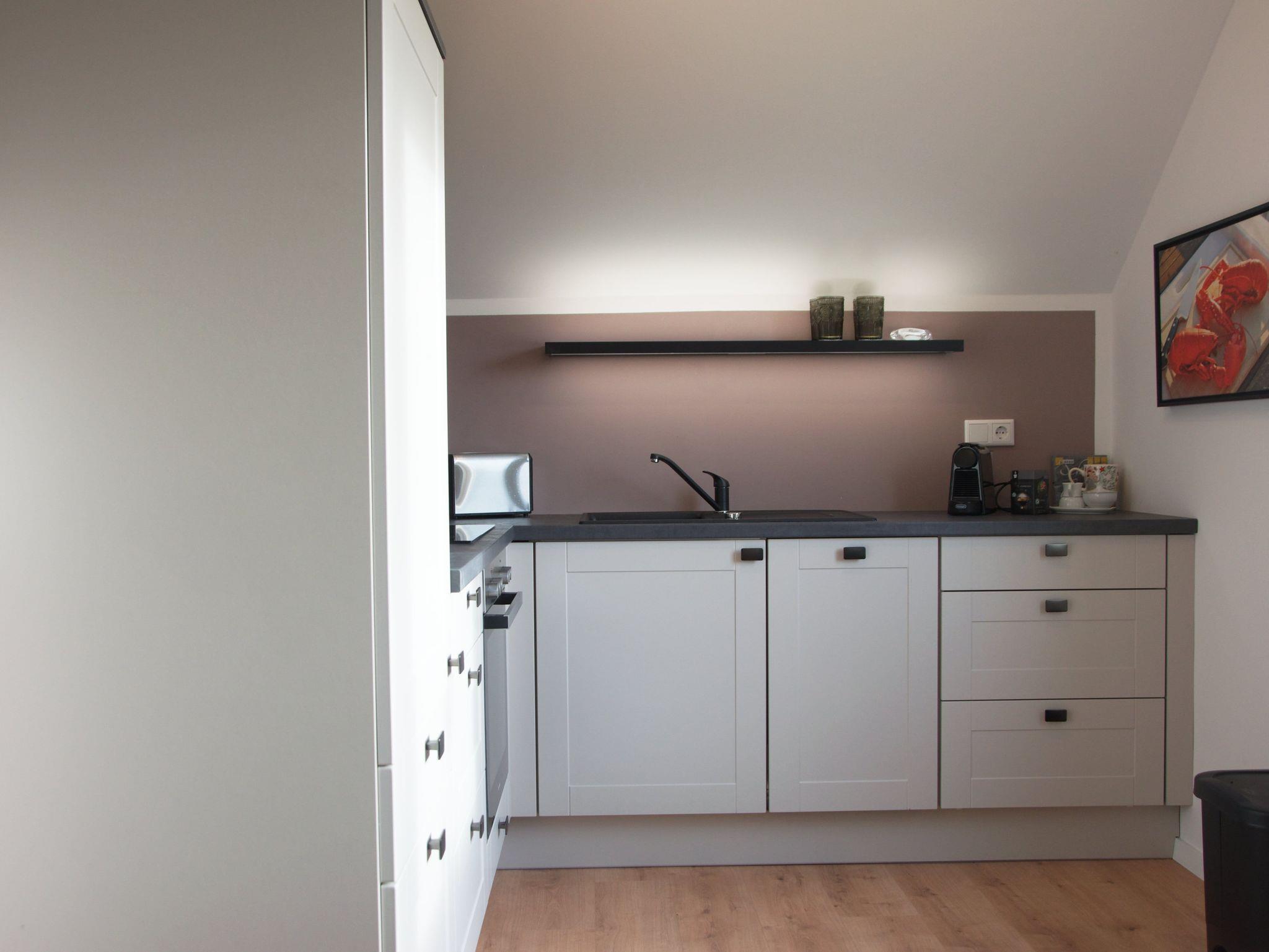 Die Ferienwohnung ist mit allen wichtigen Dingen ausgestattet. Die Küche beinhaltet ein komplettes Sortiment an Geschirr und alltäglichen Haushaltshelfern wie ein Wasserkocher, Toaster, Backofen & Spülmaschine sowie eine Kapsel-Kaffeemaschine.