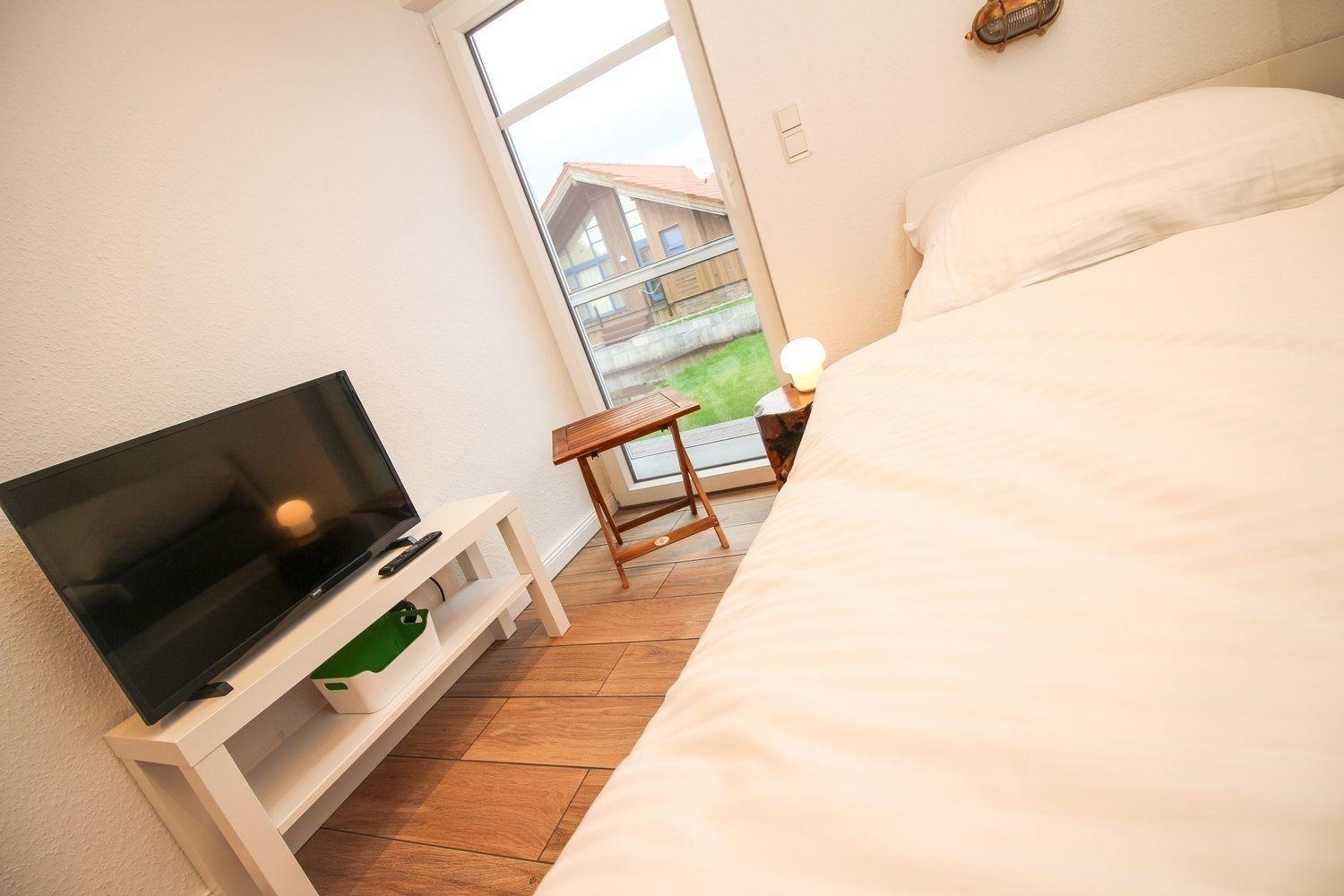 Ein drittes Schlafzimmer mit einem Einzelbett, Nachttisch, Kleiderschrank und Flachbild-TV befindet sich im Erdgeschoss.