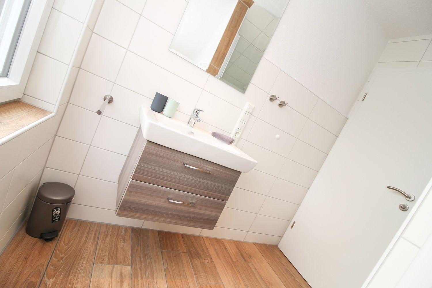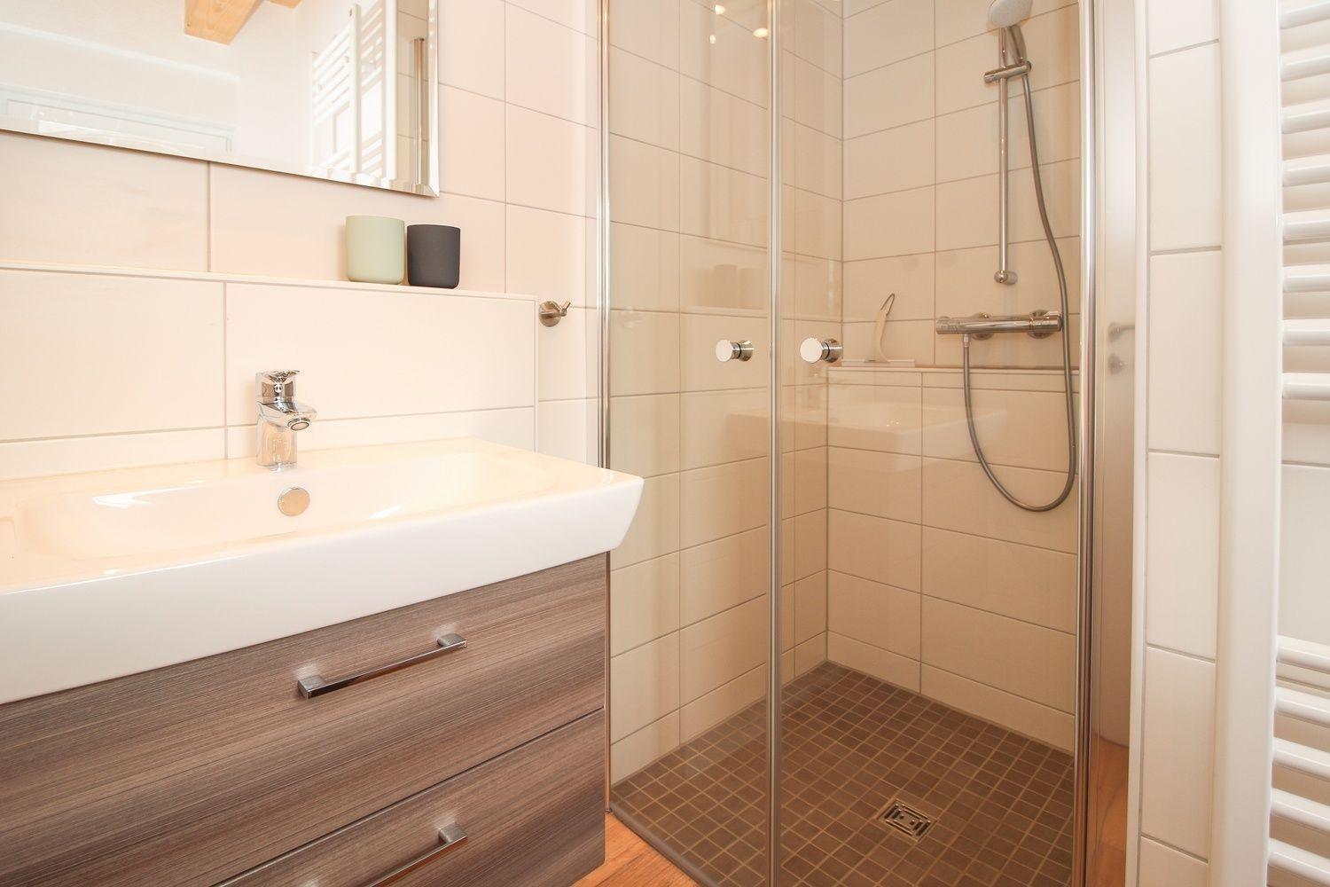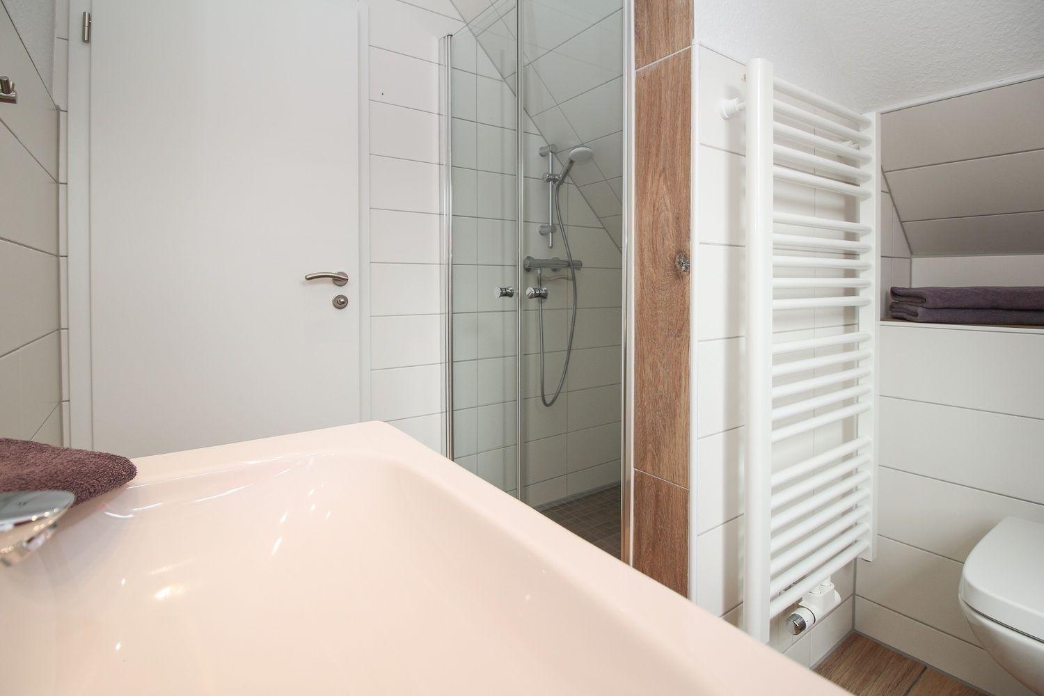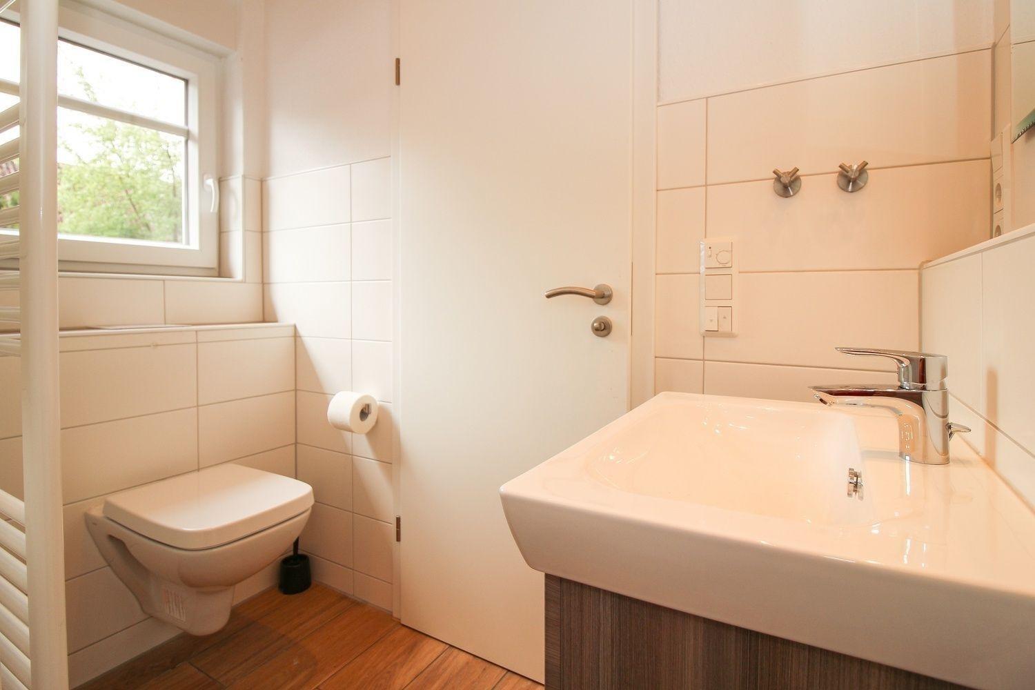 Das erste Bad befindet sich im Erdgeschoss. Dusche, WC und Waschtisch mit Unterschrank - alles ist vorhanden. Der Handtuchwärmer schenkt an kalten Tagen warme Handtücher.