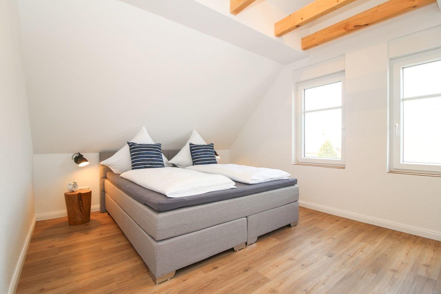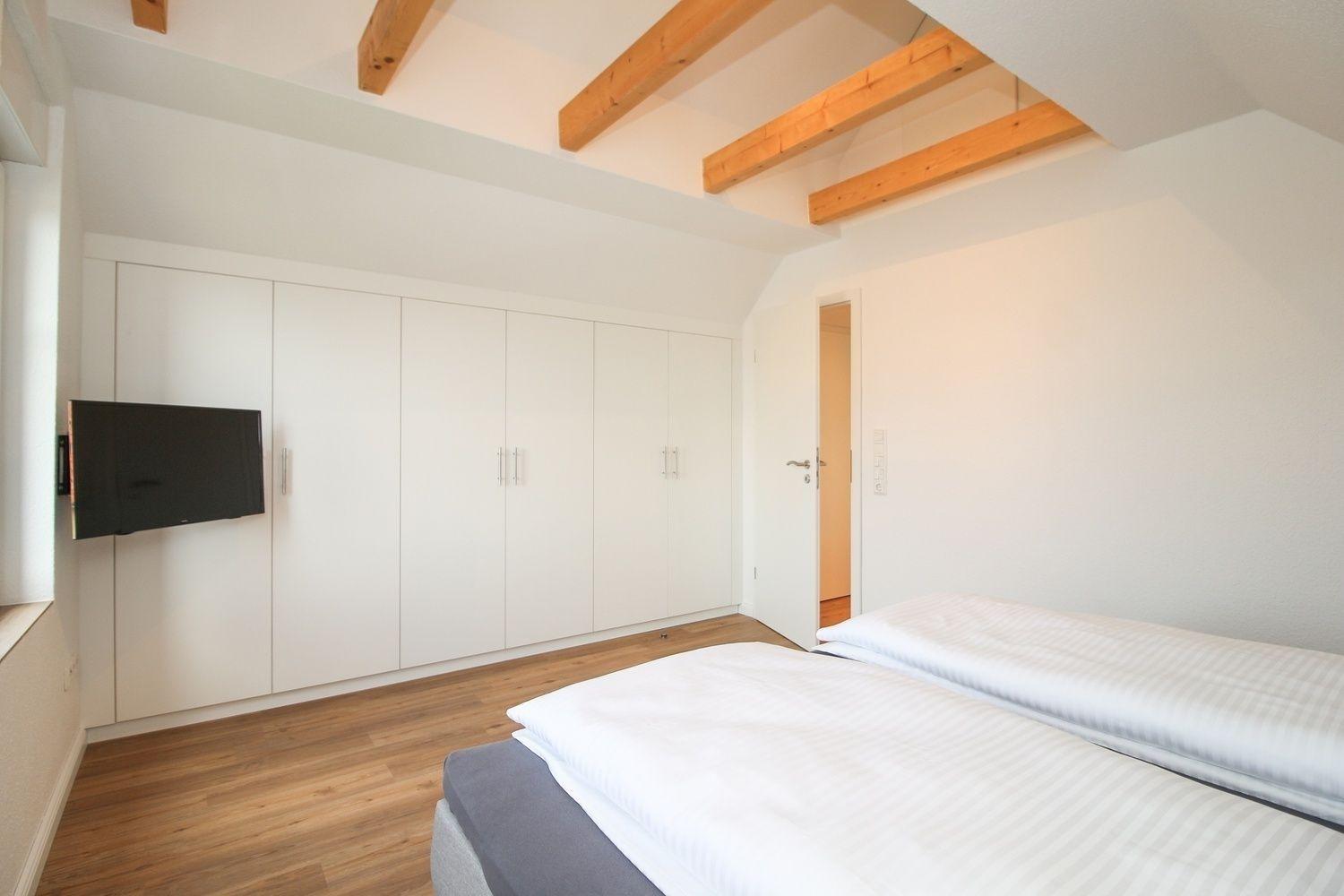 Im großen Schlafzimmer, das durch seine sichtbare Balkenlage luftig wirkt, befindet sich ein bequemes Boxspringbett. Der sehr geräumige Kleiderschrank wurde vom Tischlermeister passgenau eingebaut. Ein Flachbild-TV fehlt natürlich auch nicht.