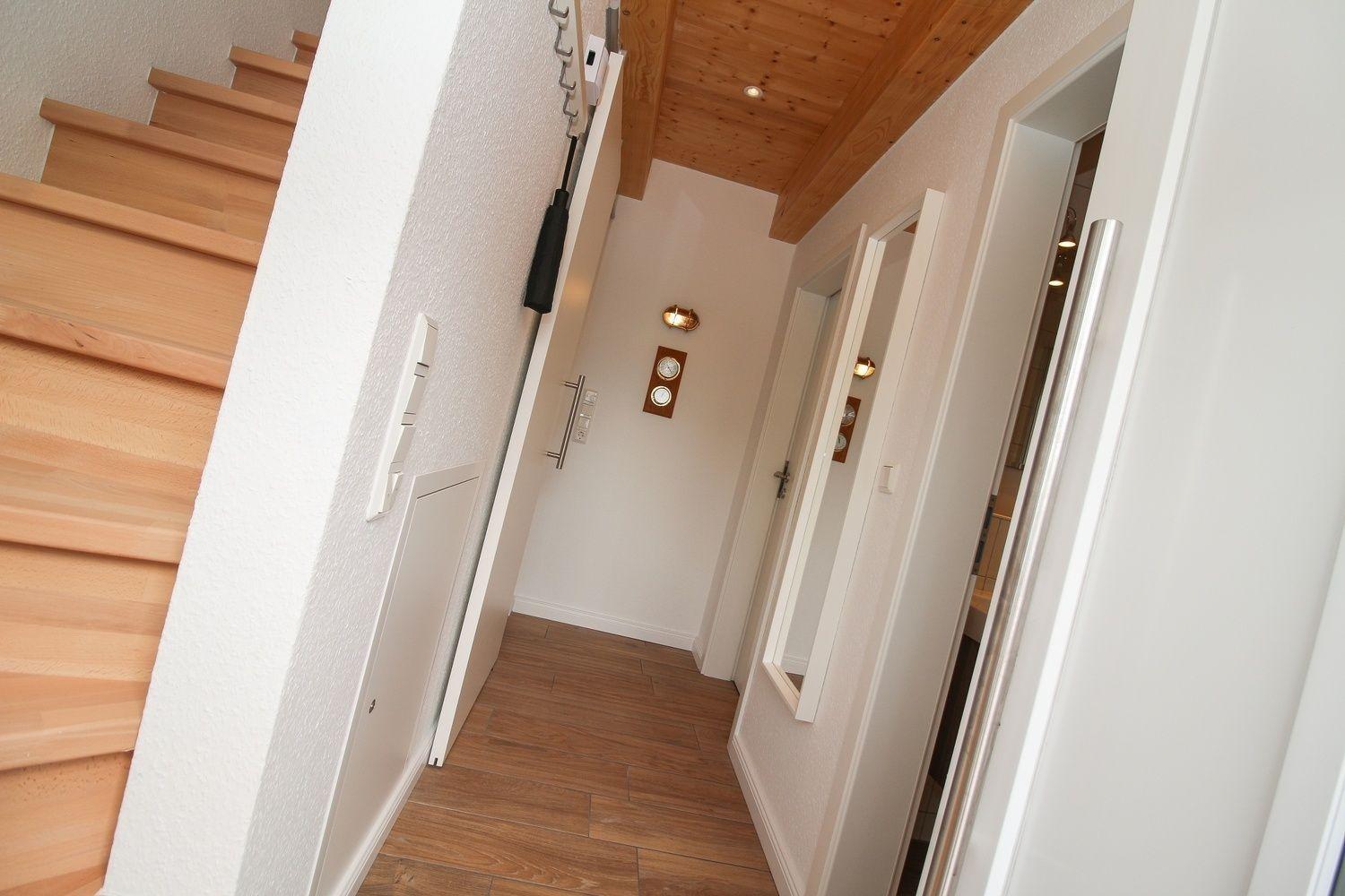 Vom Flur im Oberschoss gehen zwei Schlafräume, der Heizungsraum und ein weiteres Bad ab. Die Treppe ist dort mit einem Treppenrollo geschützt.