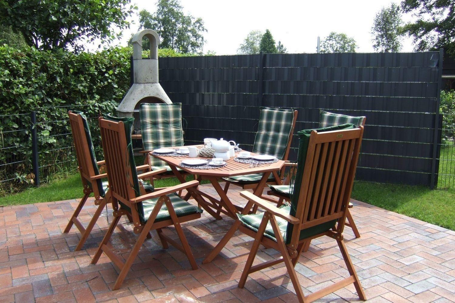 Auf der großen Sonnenterrasse stehen die Gartenmöbel und der Kamingrill für Sie bereit.