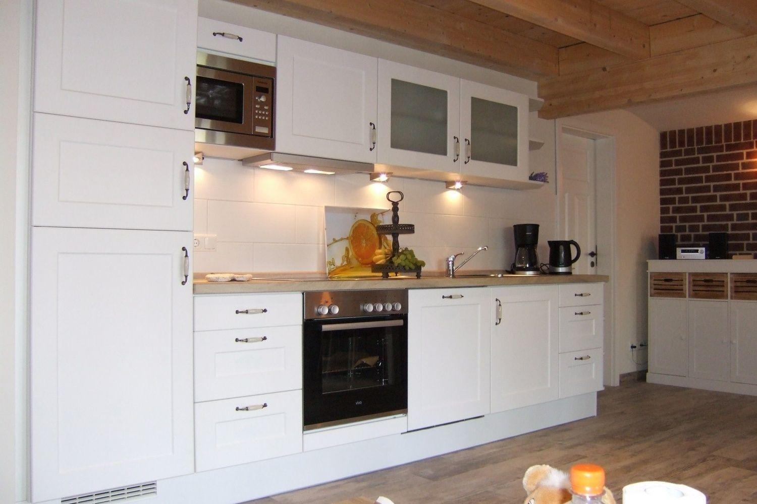 In der modernen Landhausküche finden Sie alles was das Herz begehrt. Neben der Kaffeemaschine, Toaster, Eierkocher, Mixer, Wasserkocher gehören eine Mikrowelle, Backofen mit Ceranfeld, Kühlschrank mit großem Gefrierfach und ein Geschirrspüler zur guten Ausstattung.