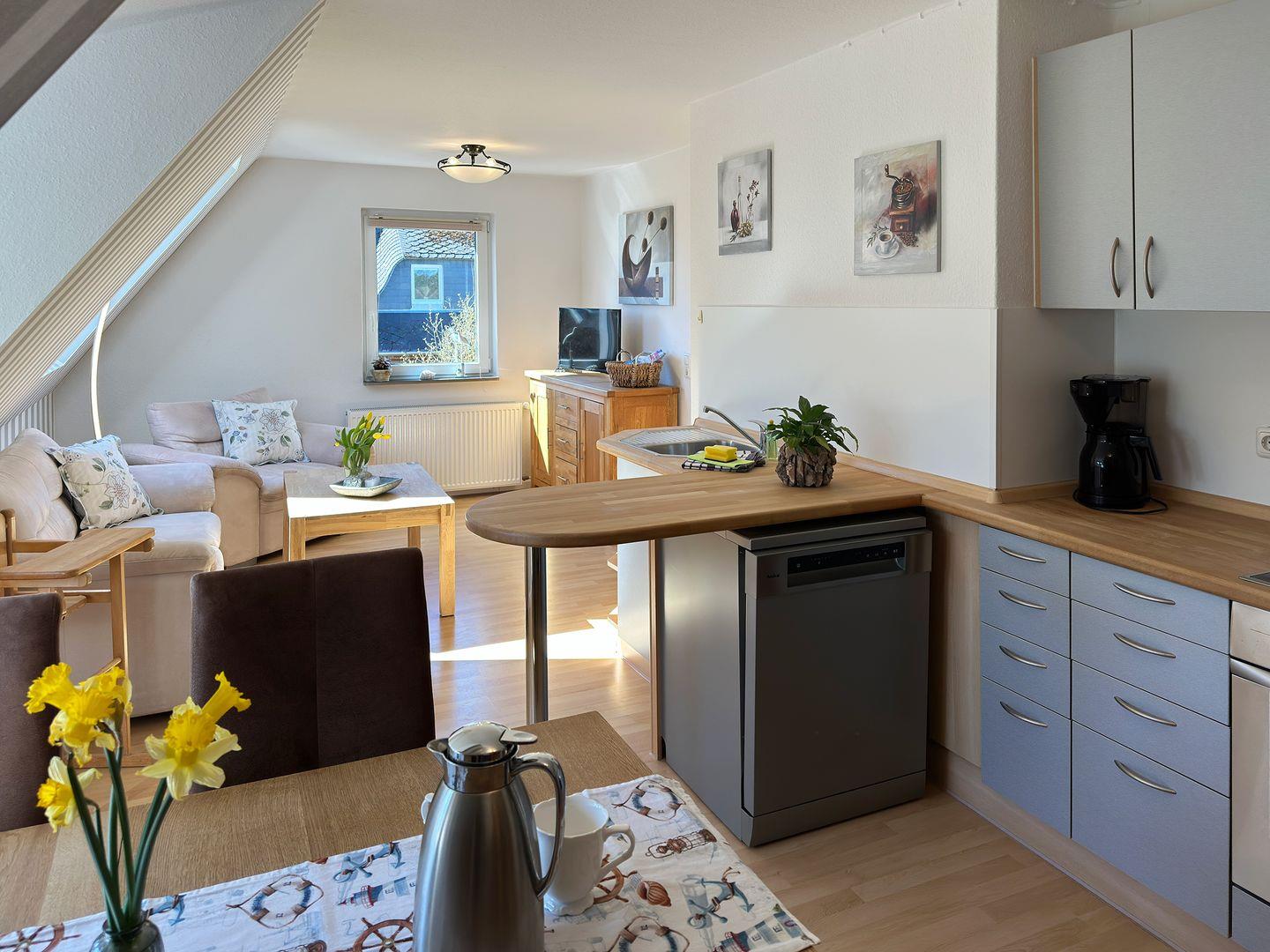 Die Wohnung verfügt über 1 Wohnraum mit Sat-TV und offener Küche, 2 Schlafzimmer, 1 Badezimmer mit Dusche und WC; Terrasse und Gemeinschaftsgarten.