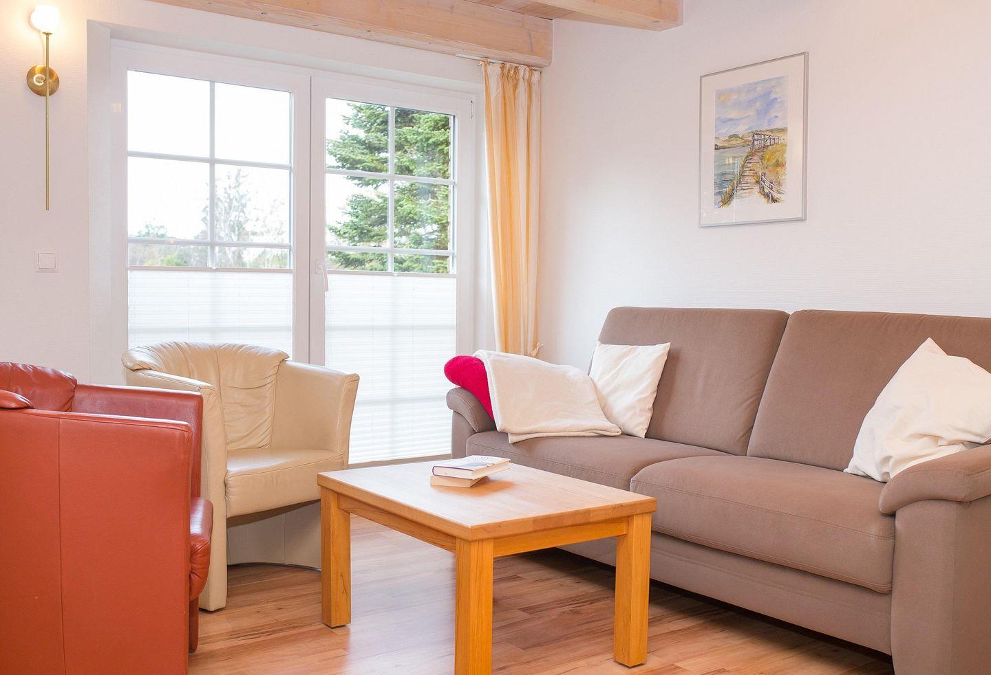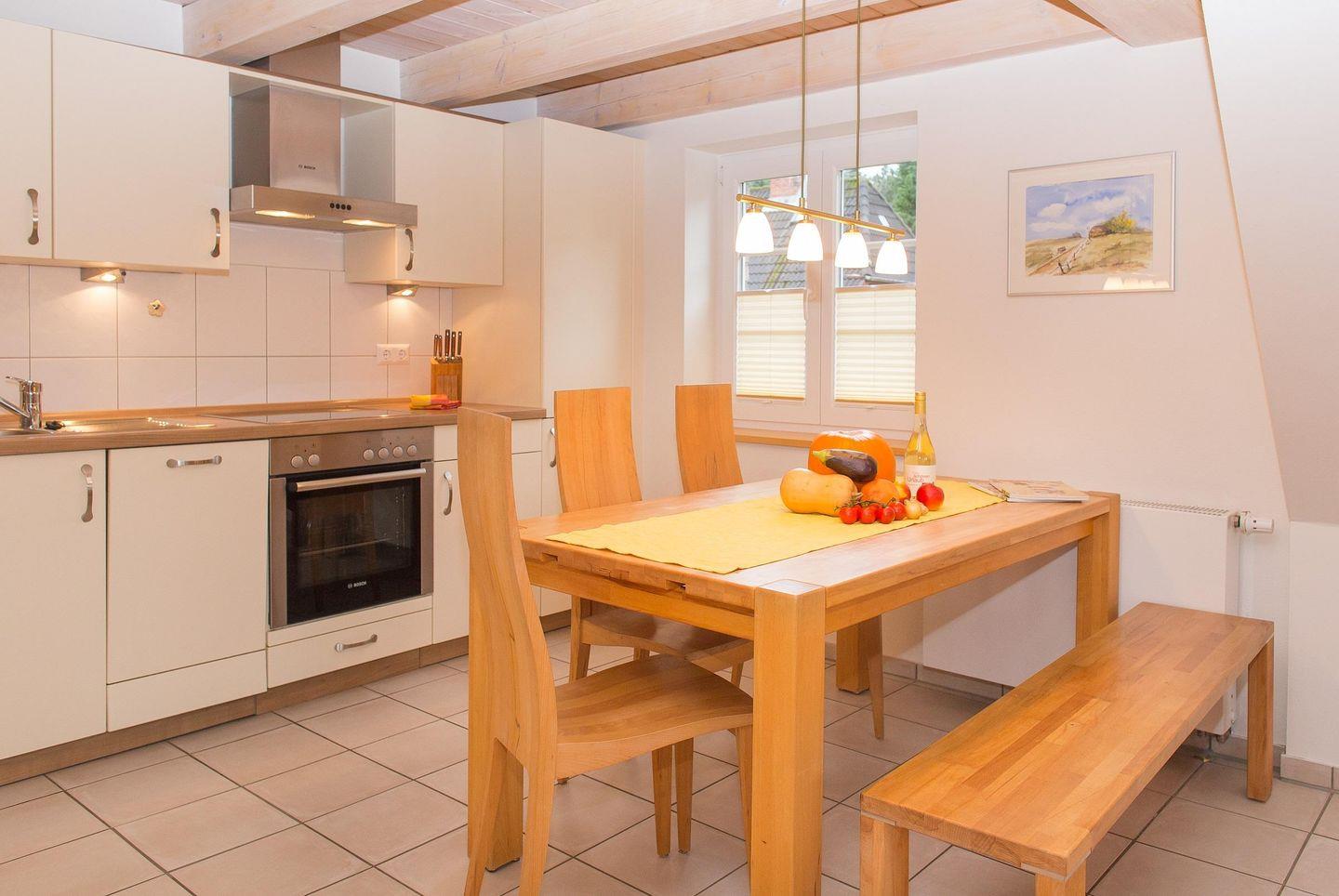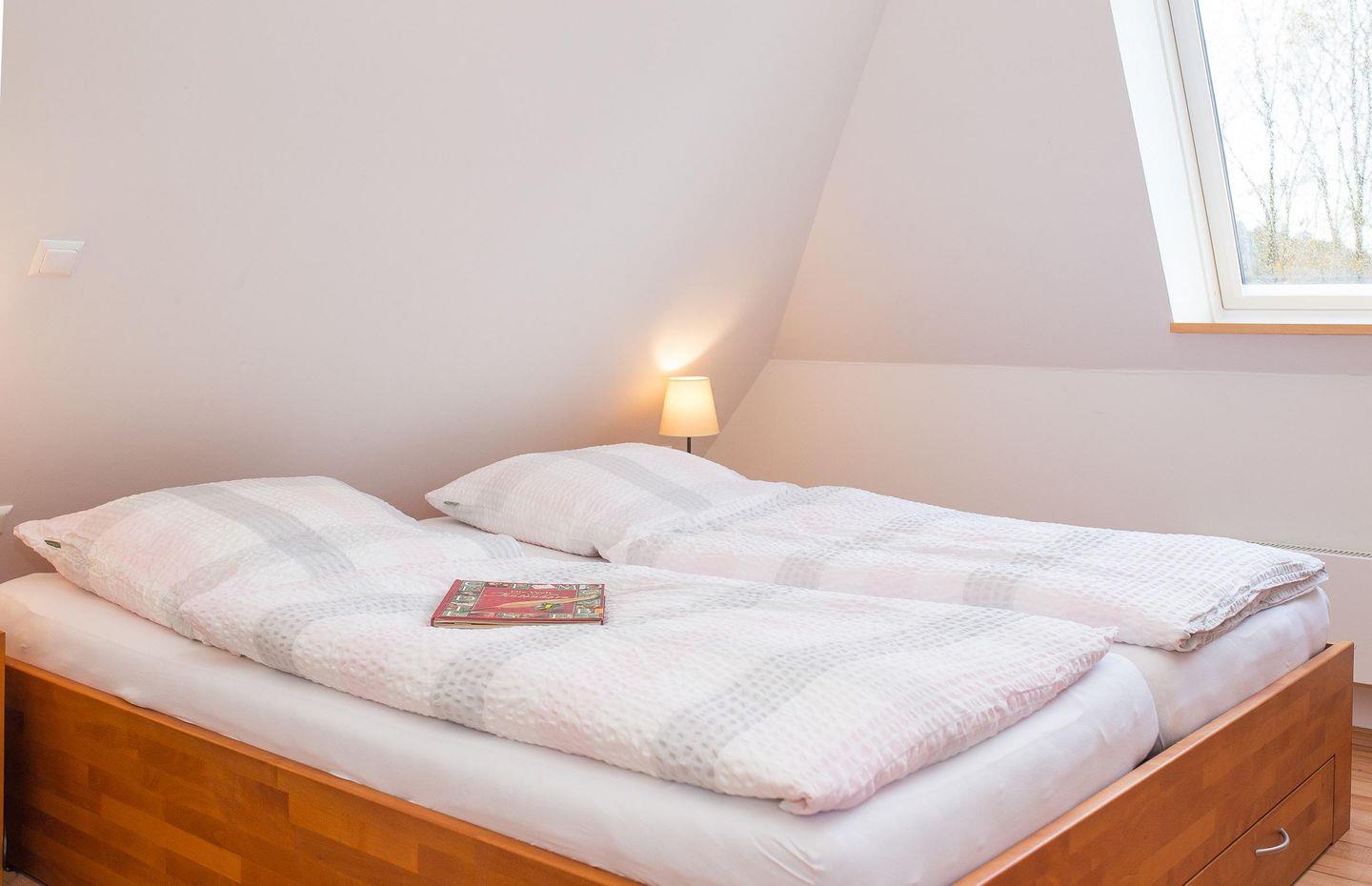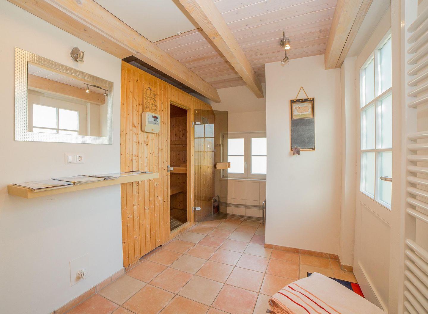 Die Wohnräume sind großzügig und komfortabel eingerichtet, inklusive einer modernen, komplett ausgestatteten Küchenzeile, die mit Geschirrspüler, Backofen, Ceranfeld und Mikrowelle keine Wünsche offenlässt. Alle Bäder sind mit Fußbodenheizung und Handtuchheizkörpern ausgestattet. Im Wohnzimmer tragen Fernseher, Telefon, Stereoanlage mit DVD-Player sowie ein Internet-Anschluss zur Unterhaltung bei. Es gibt ein bis zwei Schlafräume, sowohl mit Doppelbett als auch mit Einzelbetten. Auch Saunafreunde kommen nicht zu kurz: Die im Nebengebäude auf dem Grundstück befindliche Sauna ist ganzjährig für Sie betriebsbereit. Ebenfalls im Nebengebäude befinden sich eine Waschmaschine und ein Trockner.