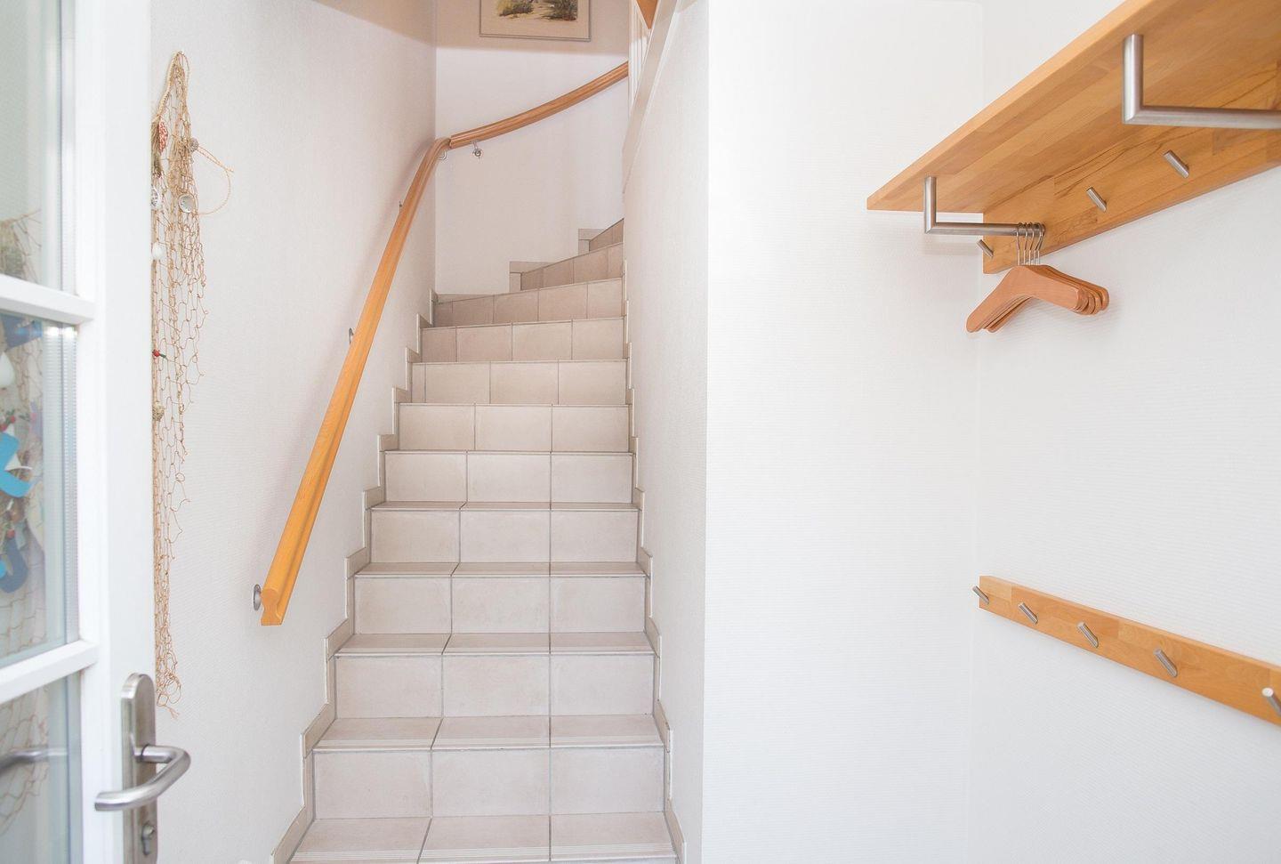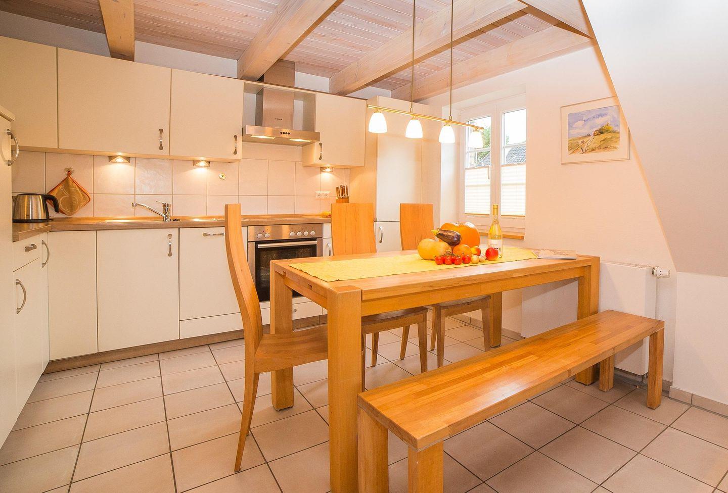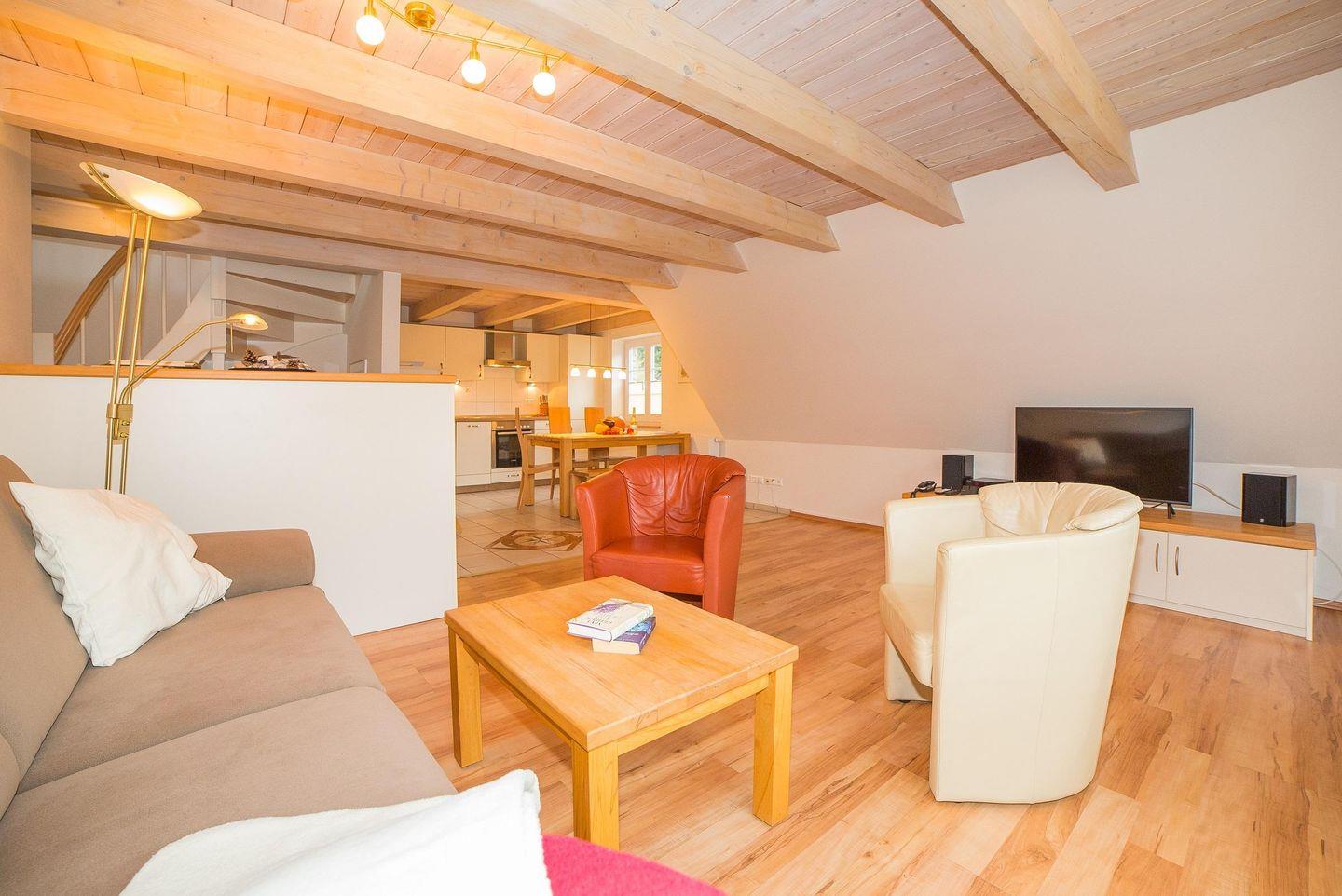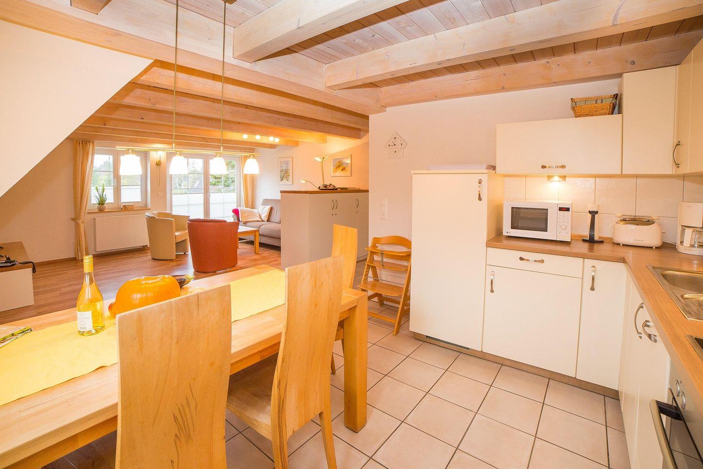 Die Wohnung Sonnendeck befindet sich im Obergeschoss in süd-westlicher Ausrichtung und ist für bis zu vier bis fünf Personen geeignet. Die Wohnung verfügt über 70 m² und erstreckt sich über zwei Etagen. Über eine Treppe gelangen Sie in ein großzügiges Wohnzimmer mit einem französischen Balkon. Die geräumige und komplett ausgestattete Küche ist in den Wohnbereich integriert und lässt mit Geschirrspüler, Backofen, Ceranfeld und Mikrowelle keine Wünsche offen. Auf der gleichen Ebene befinden sich ein Duschbad mit Fußbodenheizung sowie ein Schlafzimmer mit zwei einzelnen Betten. Das zweite Schlafzimmer im Spitzboden enthält ein Doppelbett und eine Einzelschlafmöglichkeit. Auf diesem Stockwerk ist ein weiteres Bad mit Badewanne und Fußbodenheizung vorhanden. In der Wohnung befinden sich ein Fernseher, ein Telefon, eine Stereoanlage mit DVD-Player sowie ein Internet-Anschluss. Im großen Garten steht eine Terrasse mit Gartenmöbeln zur Verfügung. Auf Anfrage werden Babybett und Hochstuhl zugestellt.