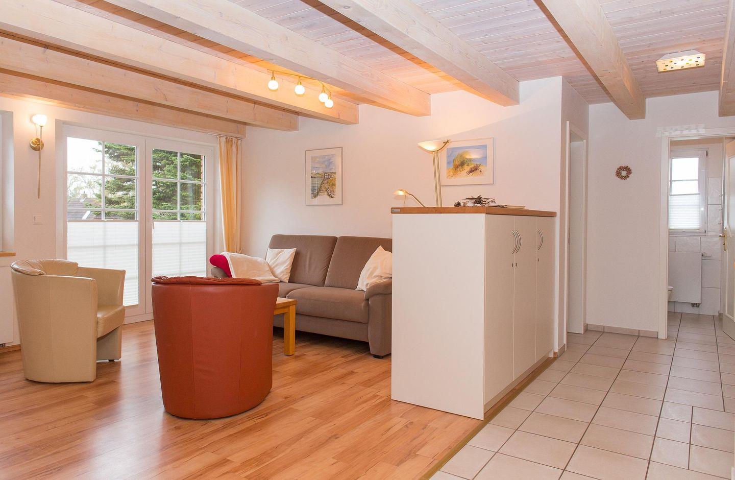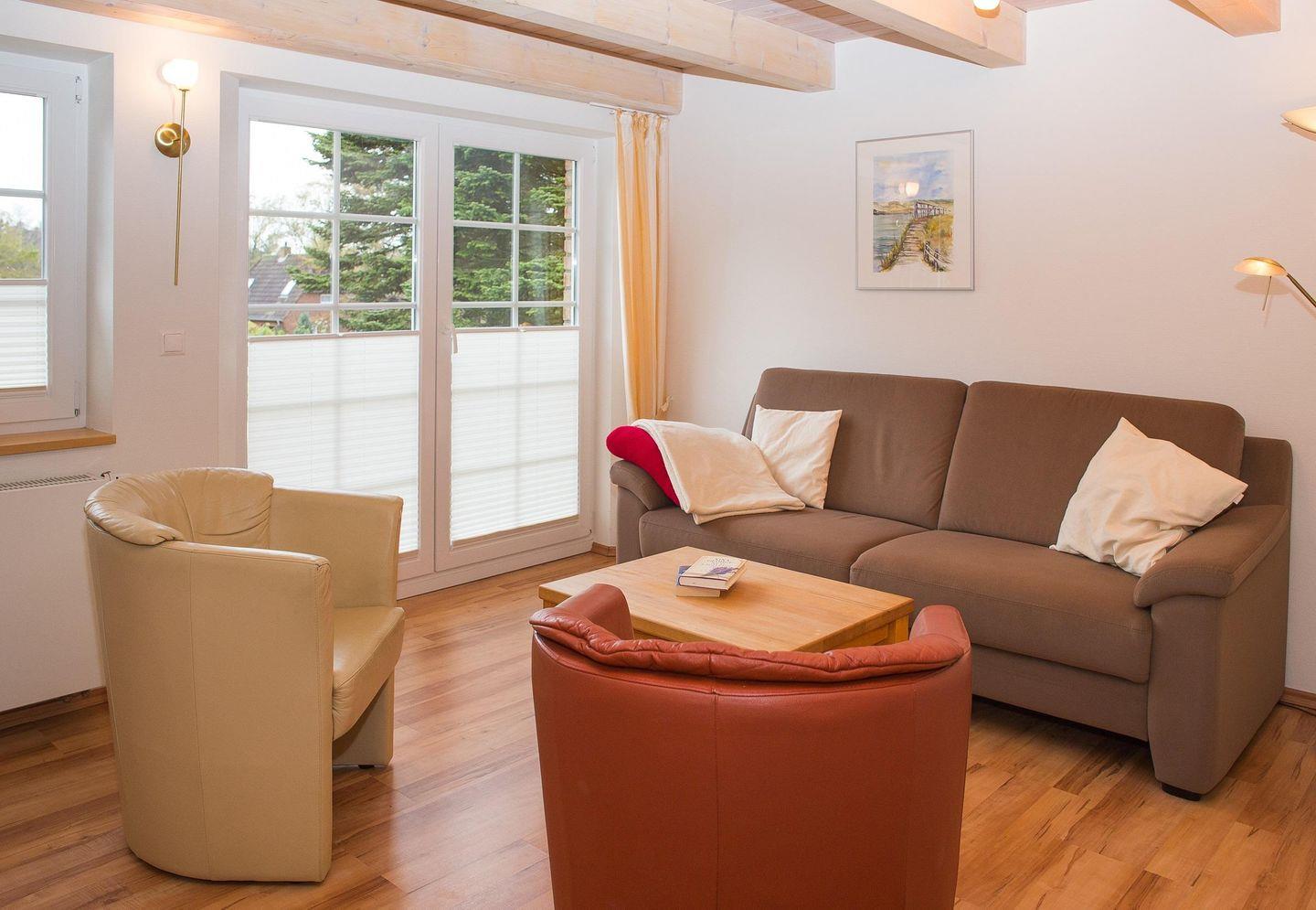 Die 40 bis 90 m² großen Ferienwohnungen im Hüs in Lee mit Terrasse im großen Garten, bieten für 2 bis 4 Personen.