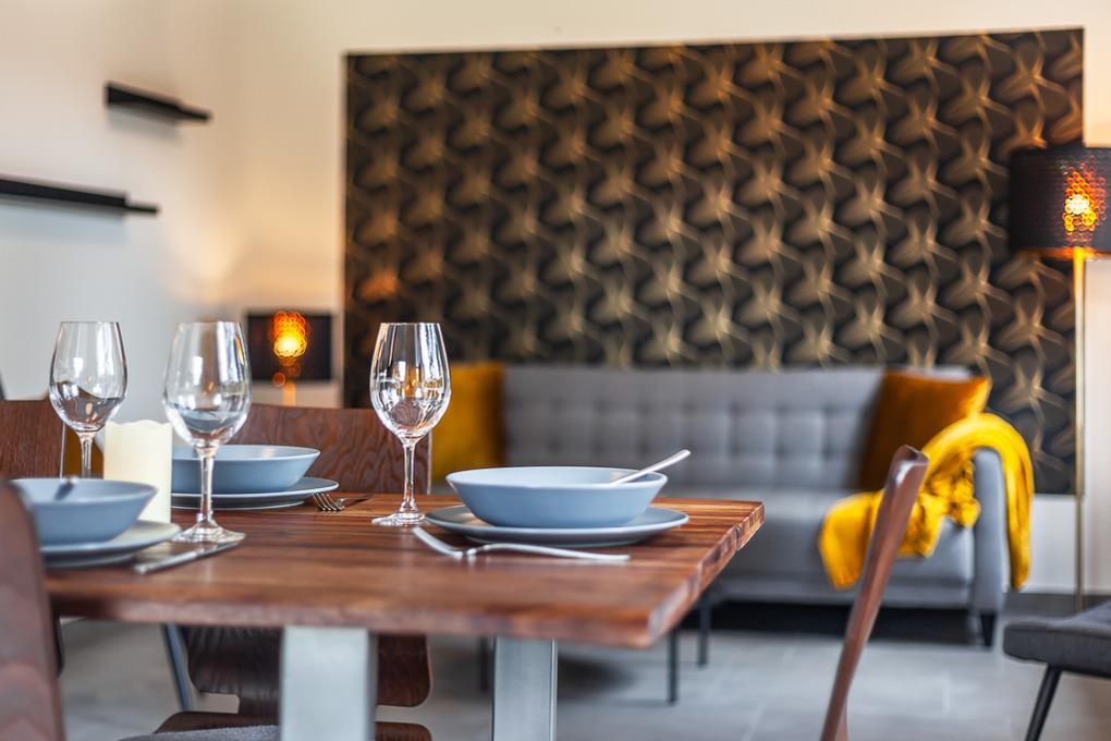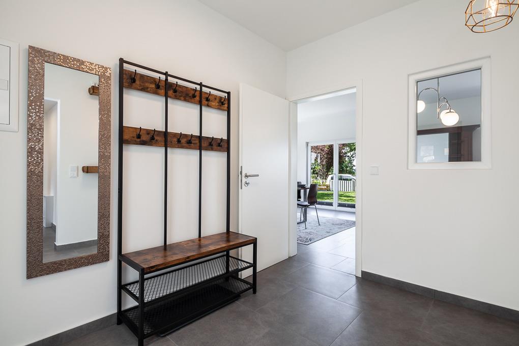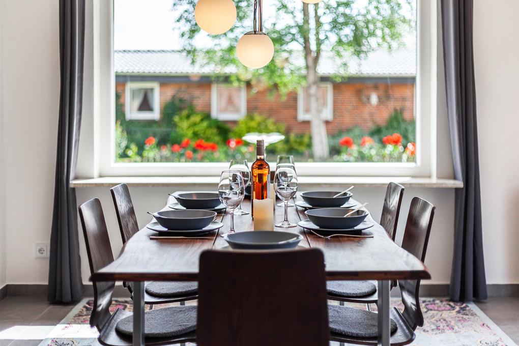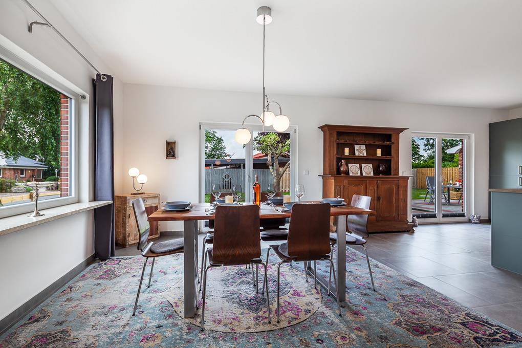 Im großzügigen Essbereich sorgt ein moderner Holztisch mit 4 wunderbar bequemen Swing-Stühlen für ausreichend Platz um die Mahlzeiten in entspannter Runde zu genießen und bietet zudem genügend Raum für ausgiebige Spiel- und Klönrunden.