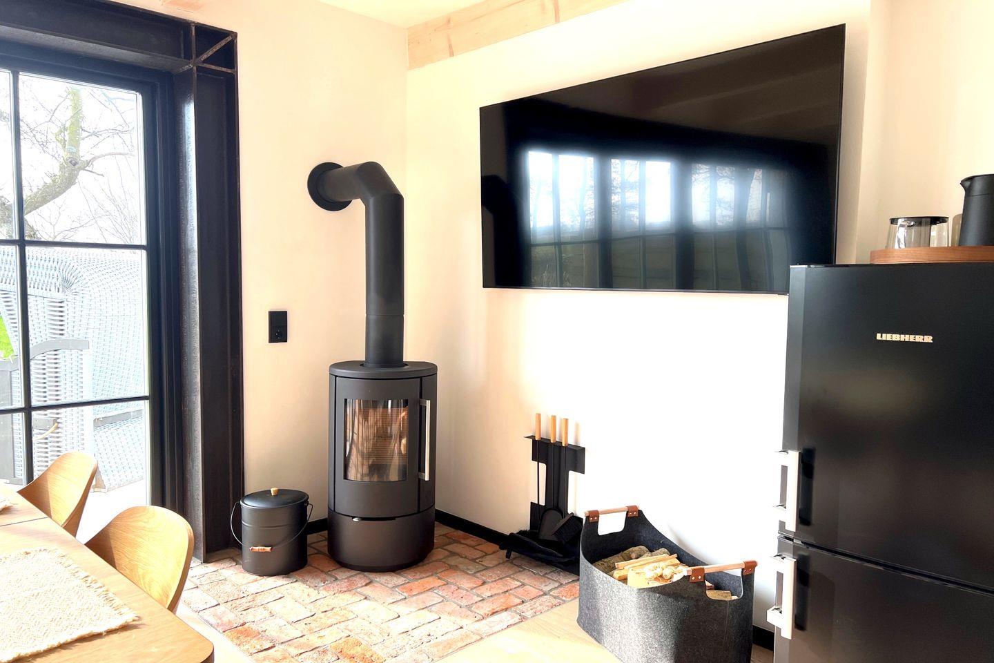 ° gemütlicher Wohnbereich mit Essecke, Sofa, Kaminofen
