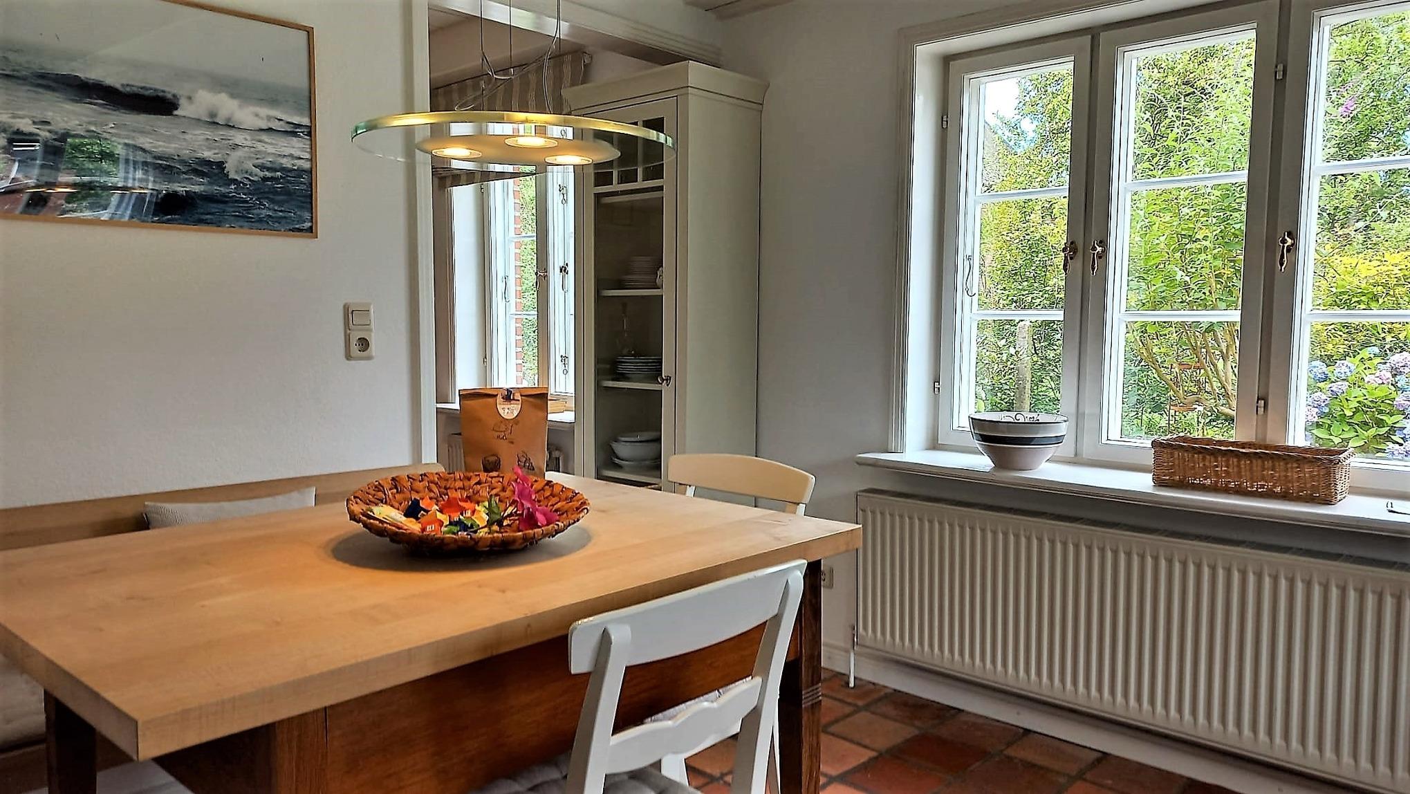 Im Erdgeschoss finden sich die vollausgestattete Küche offen zum Essbereich und Wohnzimmer. Vom gemütlichen und liebevoll eingerichteten Wohnzimmer kommen Sie direkt auf die Terrasse und in den Garten mit Gartenmöbeln und Strandkorb. Ein Gäste-WC mit Fenster befindet sich ebenfalls im Erdgeschoss. Im Obergeschoss finden Sie das Schlafzimmer (Bett 160cm x 200cm), in dem man sich nur Wohlfühlen kann, ein Kinderzimmer mit zwei Einzelbetten (80cm x 200cm)und das Badezimmer mit Dusche. Per Fahrrad sind Sie in ca. 15 Minuten am schönsten Strand der Insel, mit Blick auf Amrum und Sylt. Sie brauchen nur wenige Minuten mit dem Fahrrad zum Einkaufen, ins Cafe oder Restaurant. Auch der alte Süderender Ortskern und seine nähere Umgebung laden zu ausgedehnten Spaziergängen oder Radtouren ein. Genießen Sie einfach die Ruhe und lassen den Alltag einfach mal hinter sich- Natur pur!