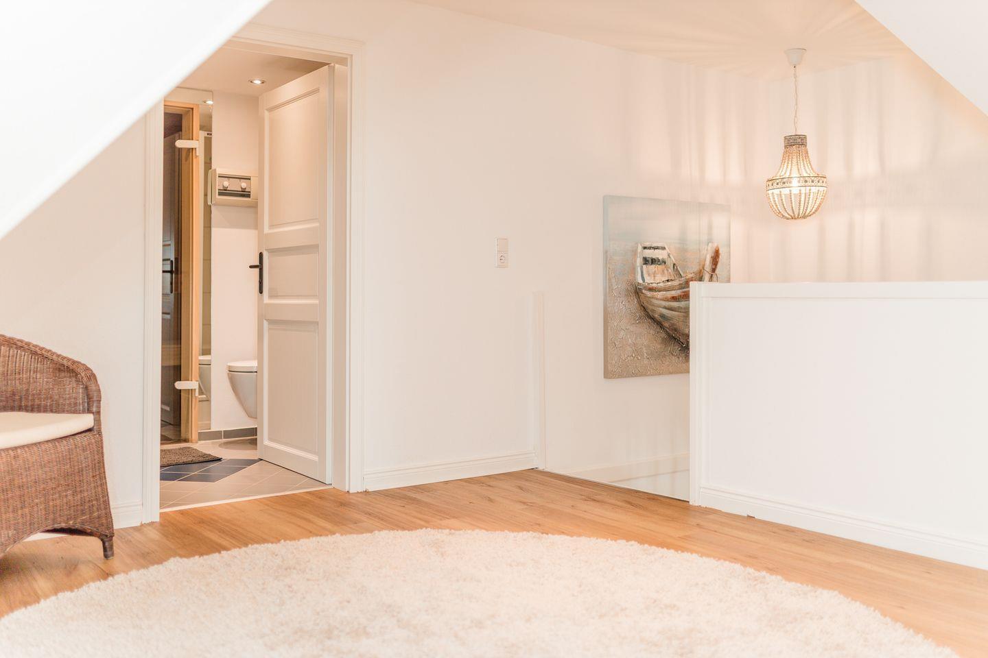 Im Obergeschoss sind drei weitere Schlafzimmer - eines mit einem Doppelbett und zwei mit je einem Einzelbett - sowie die hauseigene Sauna mit separater Dusche gelegen.