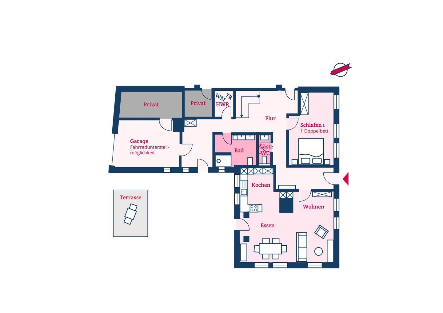 Im Erdgeschoss befinden sich der großzügige Wohn- und Essbereich mit offener Küche, ein Schlafzimmer mit Doppelbett, ein Duschbad und ein Gäste-WC sowie ein Hauswirtschaftsraum mit Waschmaschine und Trockner. Über den Essbereich gelangen Sie direkt in den eigenen eingezäunten Garten mit Terrasse.