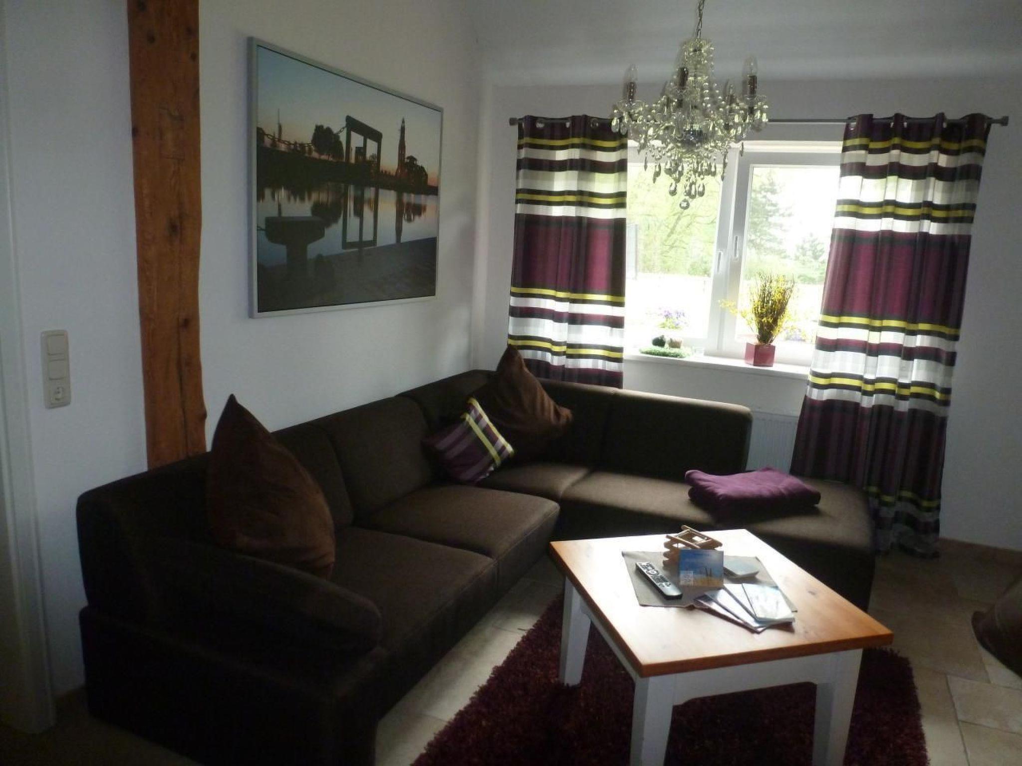 Unsere 85qm große Ferienwohnung beeindruckt durch eine sorgfältige und liebevolle Ausstattung. Sie ist ebenerdig und komplett barrierefrei gestaltet, sodass sowohl kleine als auch große Gäste mit Behinderungen hier herzlich willkommen sind. Die Wohnung bietet eine komfortable Wohnküche mit einer modernen Einbauküche, die über eine Spülmaschine, Mikrowelle und alle notwendigen Küchenutensilien verfügt. Die gemütliche braune Stoffcouch und ein Sesselsack im Wohnbereich laden zum Entspannen ein, während das Schlafzimmer im weißen Landhausstil mit einem großen Kleiderschrank und Spiegel pure Erholung verspricht. Ein weiteres Schlafzimmer mit Etagenbett und Einzelbett sowie Kleiderschrank und Schreibtisch ist ideal für Kinder.
