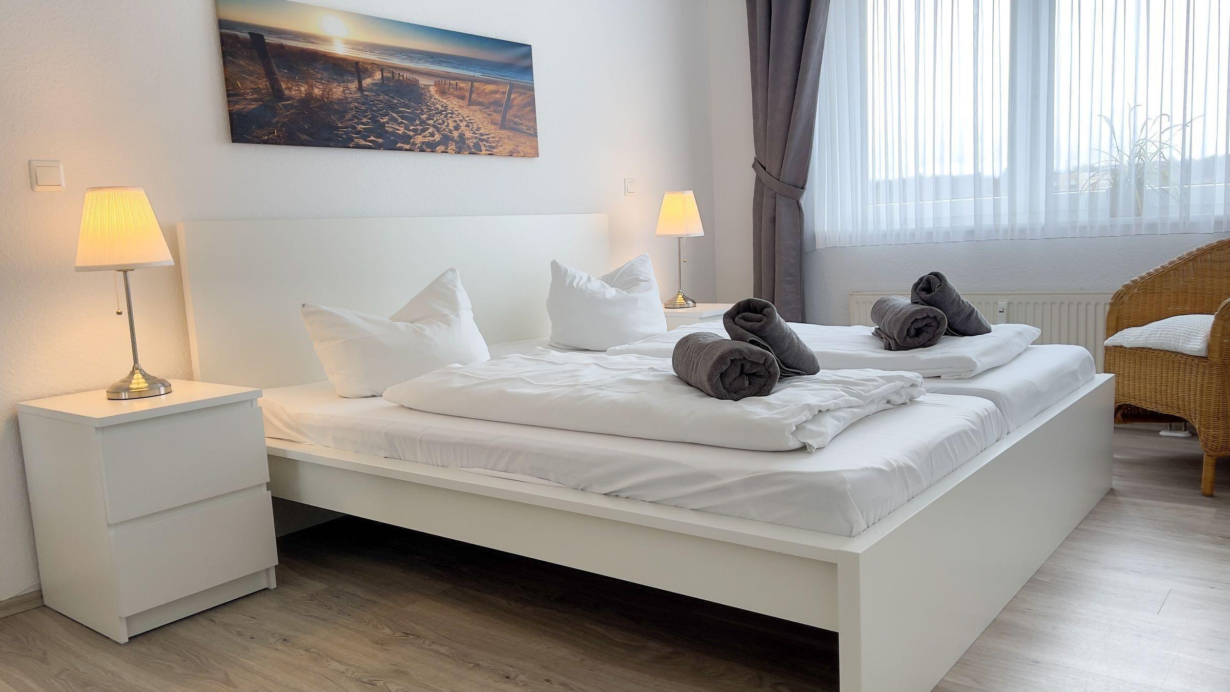 Die gemütliche Ferienwohnung im ersten Stock bietet Platz für bis zu 6 Personen und ist haustierfreundlich. Mit einem Fahrstuhl erreichbar, verfügt die Wohnung über zwei separate Schlafräume: einen mit einem Doppelbett und einen weiteren mit zwei Einzelbetten. Der Wohn-/Schlafraum bietet ein Schlafsofa für zusätzliche Schlafmöglichkeiten sowie eine Essecke. Die separate, voll ausgestattete Küche mit Geschirrspüler lädt zum gemeinsamen Kochen ein. Das renovierte Badezimmer ist mit einer ebenerdigen Dusche ausgestattet und sorgt für Komfort. Zusätzlich steht eine Waschmaschinen-/Trocknerkombination zur Alleinnutzung in der Wohnung zur Verfügung. Fahrräder können im gesicherten Fahrradkeller abgestellt werden. Zwei Balkone bieten wunderschöne Ausblicke, darunter einen seitlichen Meerblick. Die Ferienwohnung befindet sich nur ca. 200 Meter vom Strand entfernt.