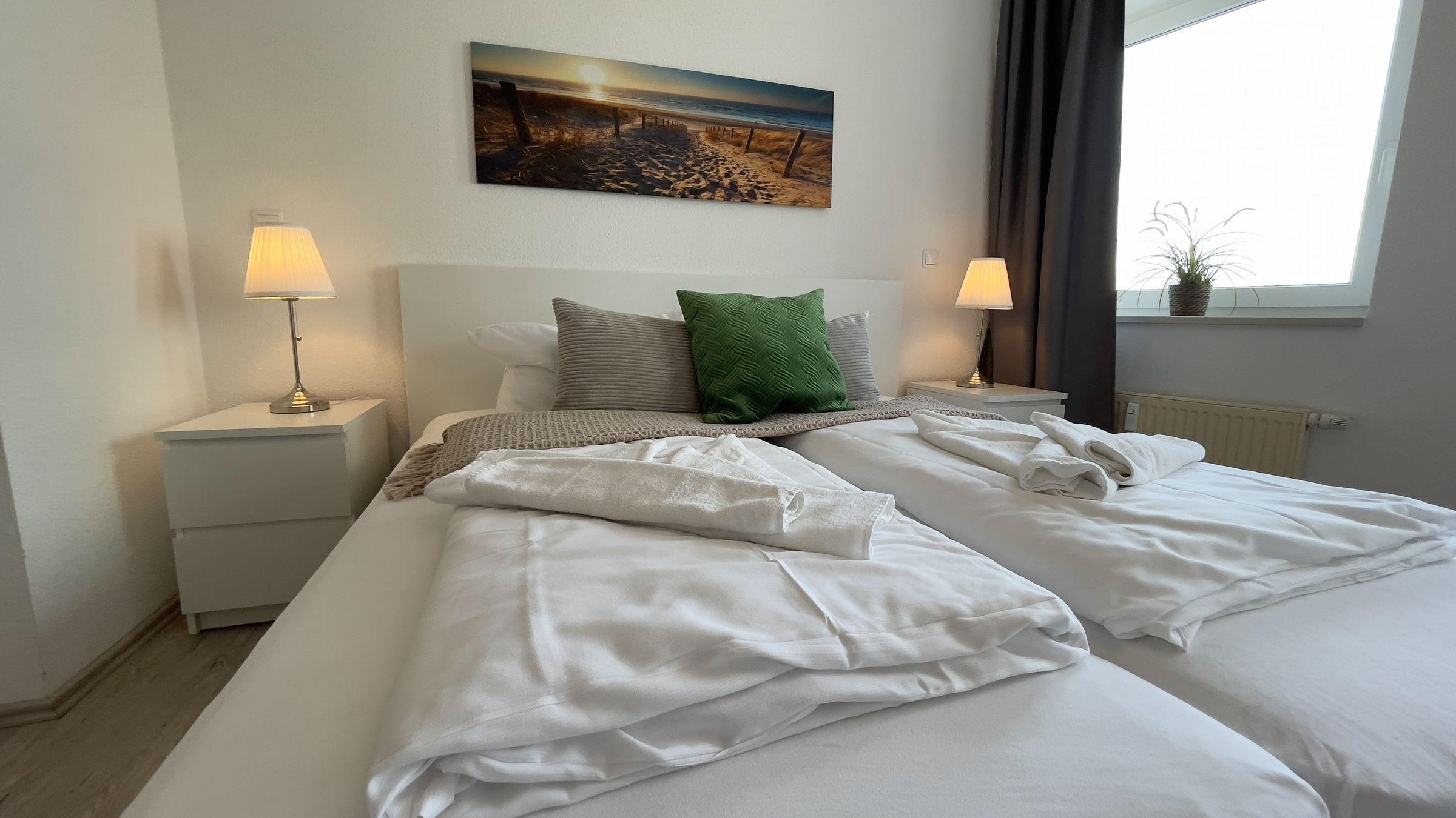 Die geräumige Ferienwohnung in Cuxhaven Sahlenburg bietet Platz für bis zu 7 Personen und ist ideal für Familien oder Gruppen. Sie verfügt über zwei separate Schlafzimmer: eines mit einem großen Doppelbett, das andere mit einem Einzelbett und einem Etagenbett. Im gemütlichen Wohnbereich befindet sich ein ausklappbares Schlafsofa. Die voll ausgestattete Küchenzeile mit Geschirrspüler ermöglicht bequemes Kochen, während die Mahlzeiten am Esstisch oder auf dem Balkon mit schönem Seeblick genossen werden können. Das moderne Badezimmer ist mit einer Badewanne und Duschfunktion ausgestattet. Gemeinschaftliche Einrichtungen wie der Fahrradkeller sowie Münz-Waschmaschinen und Trockner stehen im Keller zur Verfügung. Haustiere sind auf Anfrage willkommen. Diese Ferienwohnung verspricht Komfort und eine ruhige Lage, nur ca. 200 Meter vom Strand entfernt.