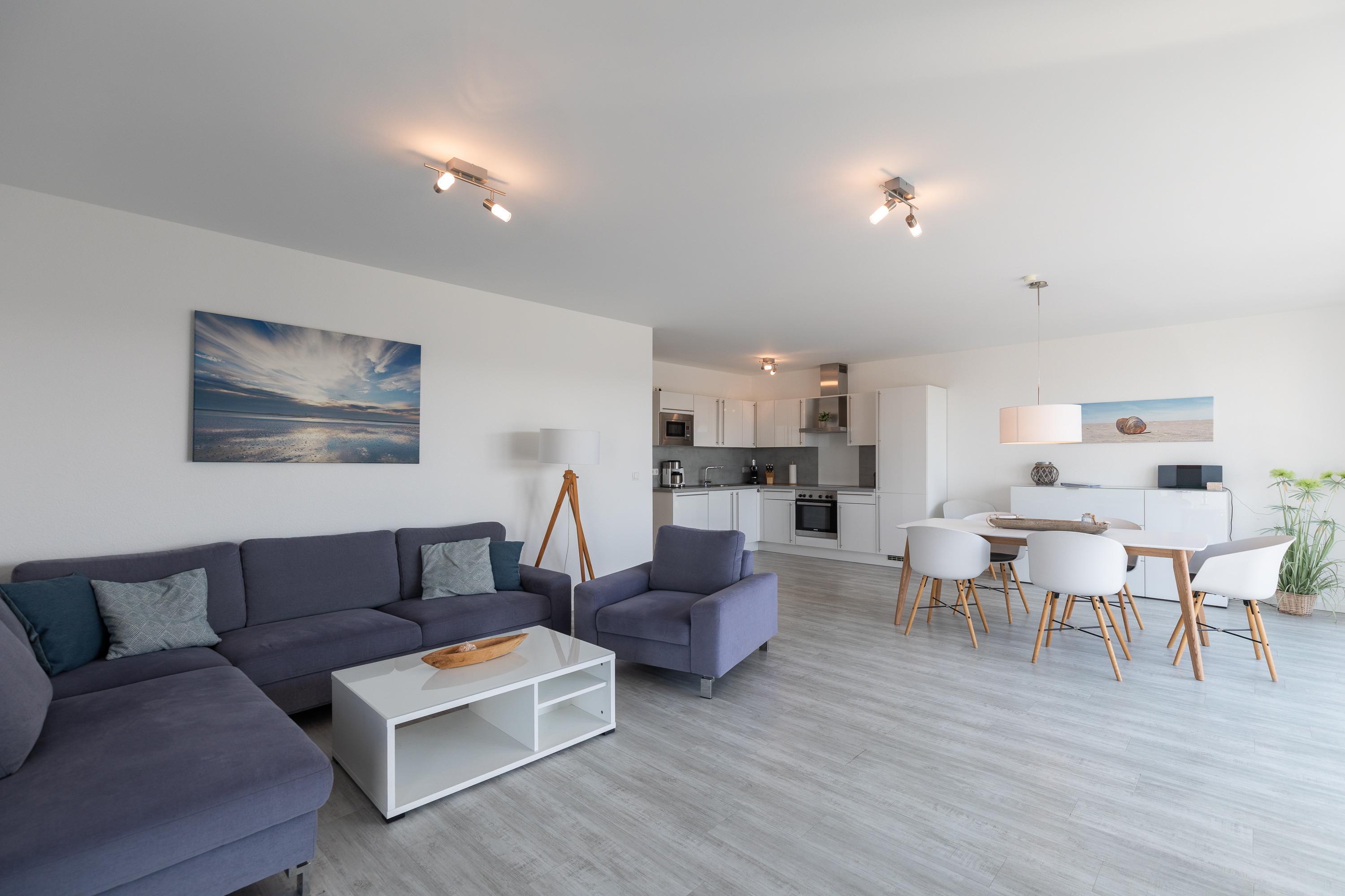 Penthouse Wohnung mit privater Sauna (kostenfrei) in der Wohnung, im großen Bad integriert, WLAN Zugang kostenfrei. Ein Kinderhochstuhl und ein Kinderreisebett stehen Ihnen in dieser Wohnung kostenlos zur Verfügung. Waschmaschine und Trockner können kostenfrei genutzt werden. Die Penthouse Wohnung eignet sich sowohl für Familien, Erholungssuchende als auch für Aktivurlauber! Genießen Sie die Leichtigkeit und Weitläufigkeit unserer Ferienhäuser und die Wohlfühlatmosphäre an der Nordsee.