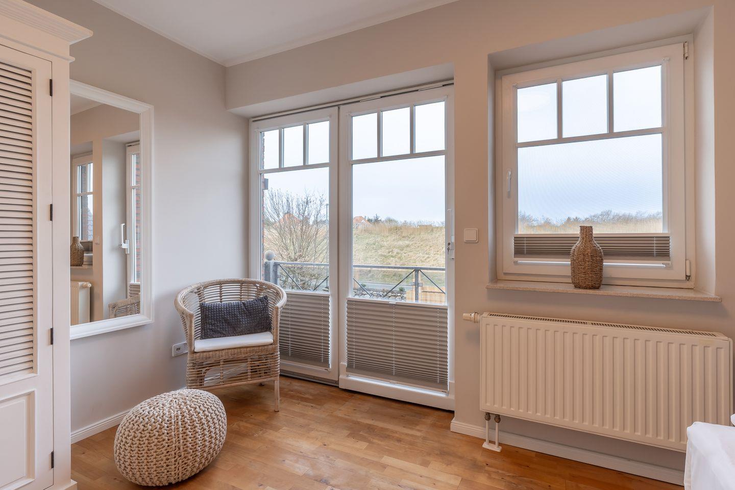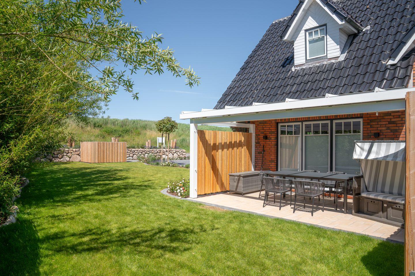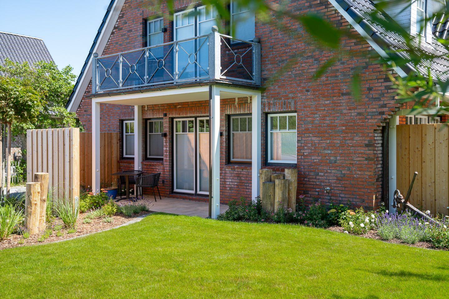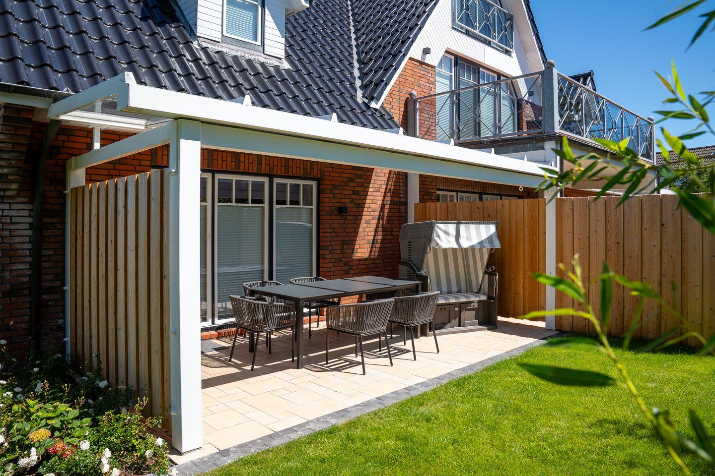 Ein weiteres Highlight der Ferienunterkunft ist der Garten, in dem Sie sich auf Gartenmöbeln entspannen können. Genießen Sie die frische Nordseeluft auf der überdachten Terrasse oder dem Balkon und verweilen Sie mit einem guten Buch oder einer Tasse Kaffee. Auch der Strandkorb im Garten bietet den perfekten Platz zum Entspannen.
