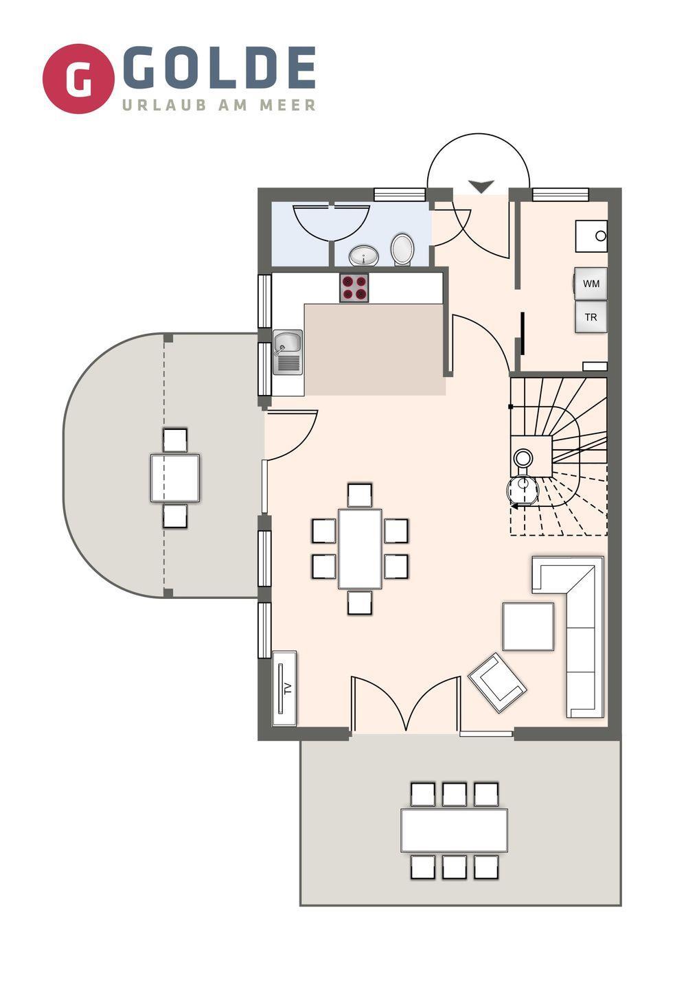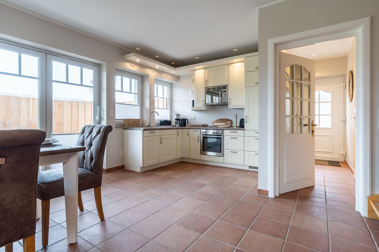 Die Unterkunft erstreckt sich über drei Etagen und bietet Ihnen eine moderne Gestaltung sowie zahlreiche Annehmlichkeiten, die Ihren Aufenthalt so komfortabel wie möglich gestalten. Im Erdgeschoss finden Sie den lichtdurchfluteten Wohnbereich, der offener zur voll ausgestatteten Küche gestaltet ist. Hier können Sie gemeinsam kochen und den Aufenthalt genießen. Die Küche verfügt über viele hilfreiche Utensilien einschließlich eines Ceranherds, Backofens, Mikrowelle und Kühlschrank mit Gefrierfach, sodass Sie hier alles Nötige finden, um Ihre Lieblingsgerichte zuzubereiten.