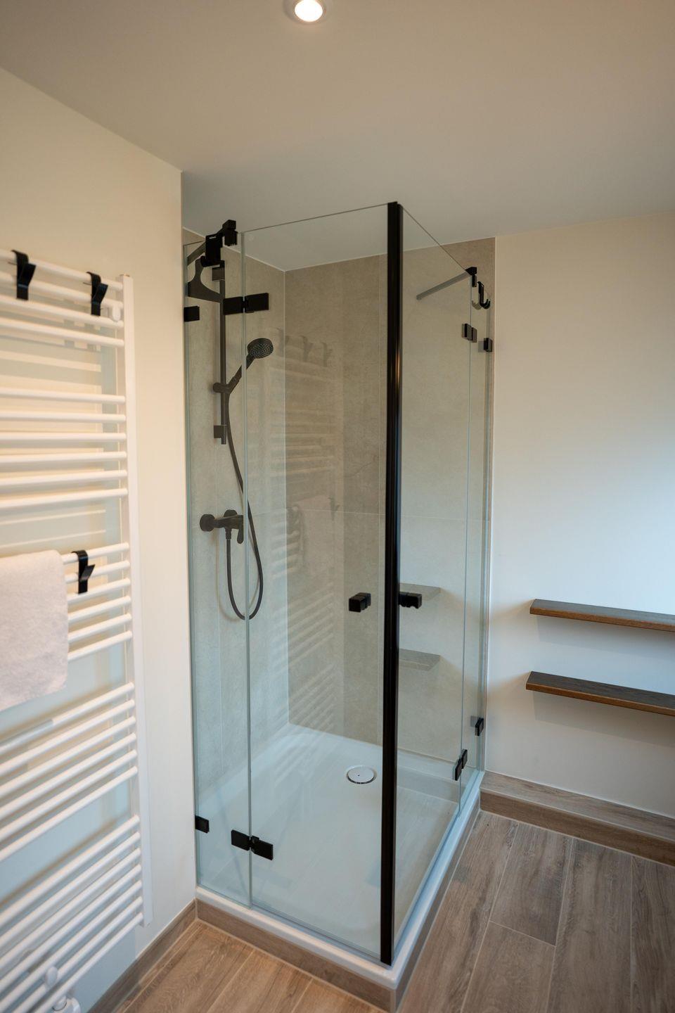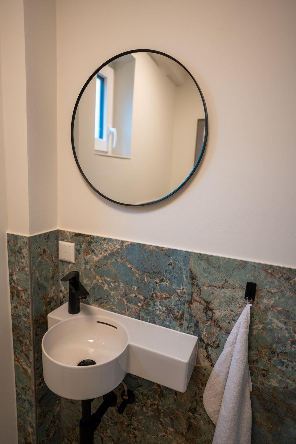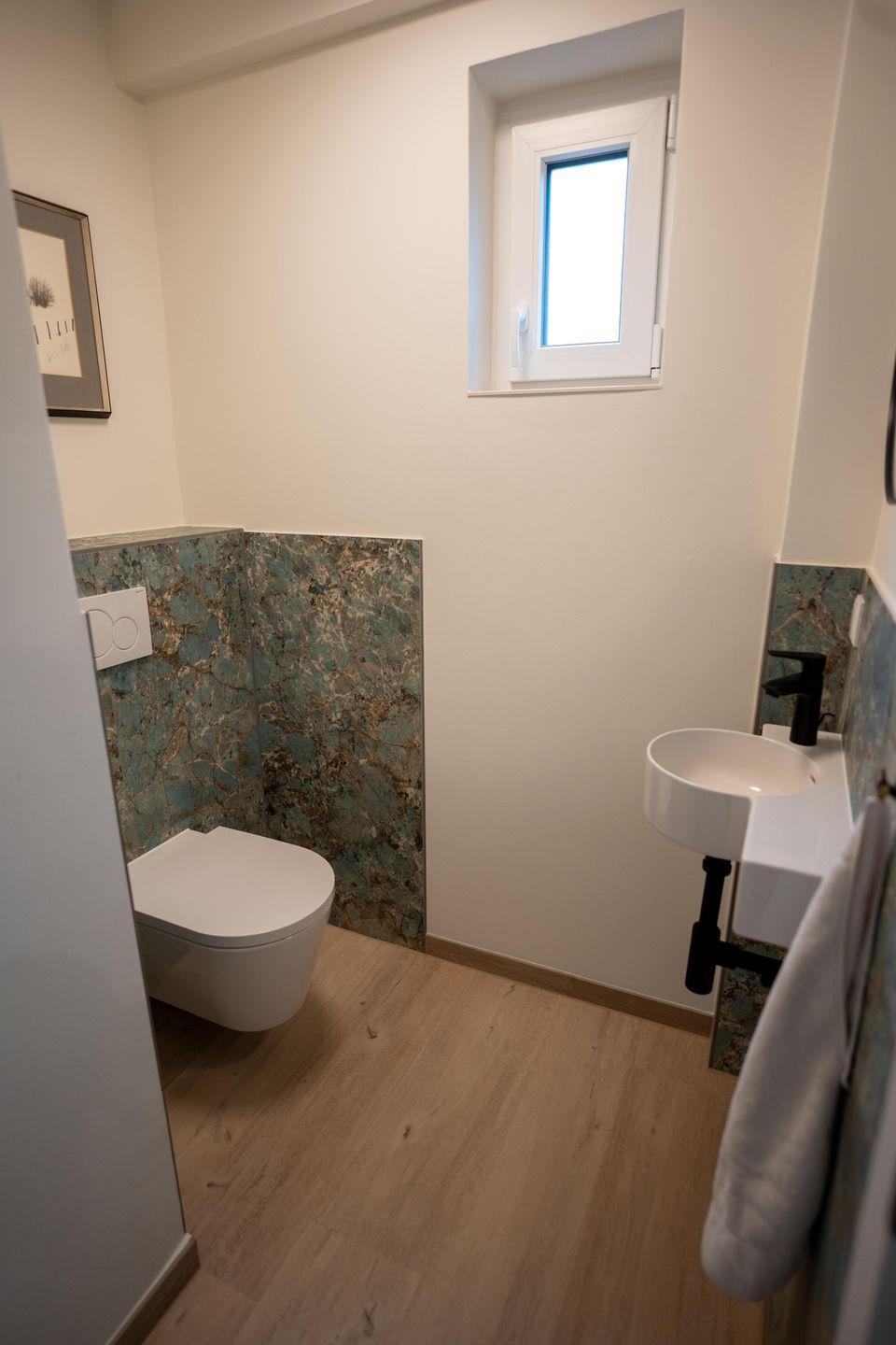 Das tageslichtdurchflutete Duschbad im OG überzeugt mit hochwertiger Ausstattung: Dusche, Waschbecken, Spiegel und WC sorgen für Frische und Funktionalität. Ein separates Einzel-WC mit Handwaschbecken im Erdgeschoss rundet das Angebot ab und sorgt für zusätzliche Flexibilität – insbesondere bei hoher Personenanzahl im Haus.