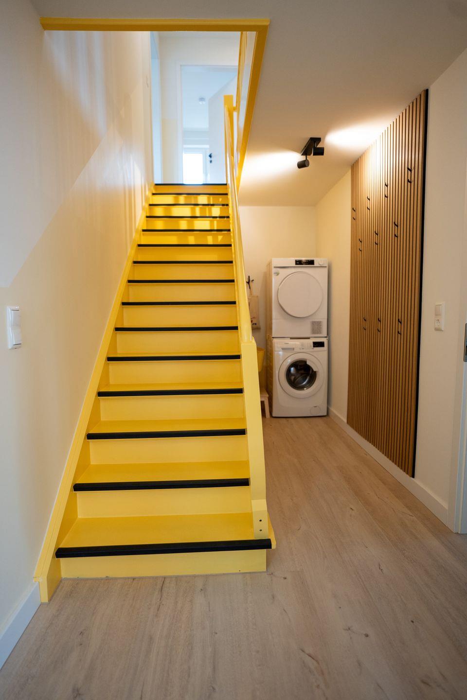 Die offene, moderne Küche ist mit hochwertigen Geräten ausgestattet – darunter Cerankochfeld, Backofen, Geschirrspülmaschine, Kaffeemaschine, Toaster und Wasserkocher. Für den täglichen Komfort steht Ihnen eine Waschmaschine sowie ein Wäschetrockner zur Eigennutzung zur Verfügung. Die Küche ist somit bestens geeignet, um sowohl schnelle Snacks als auch aufwendige Menüs zuzubereiten.