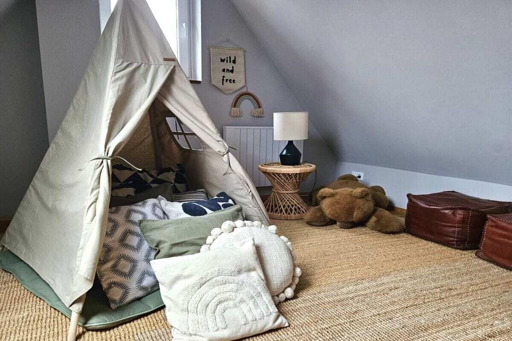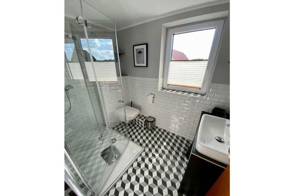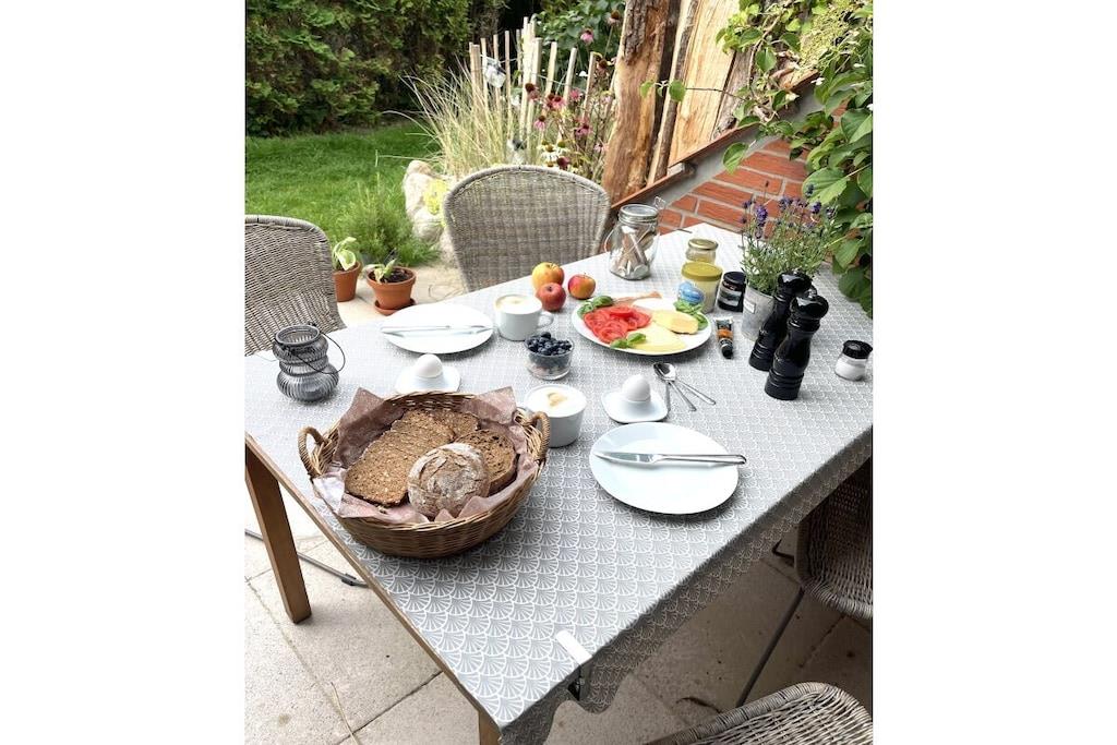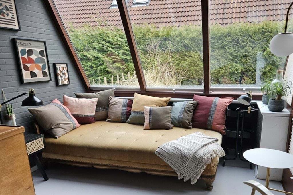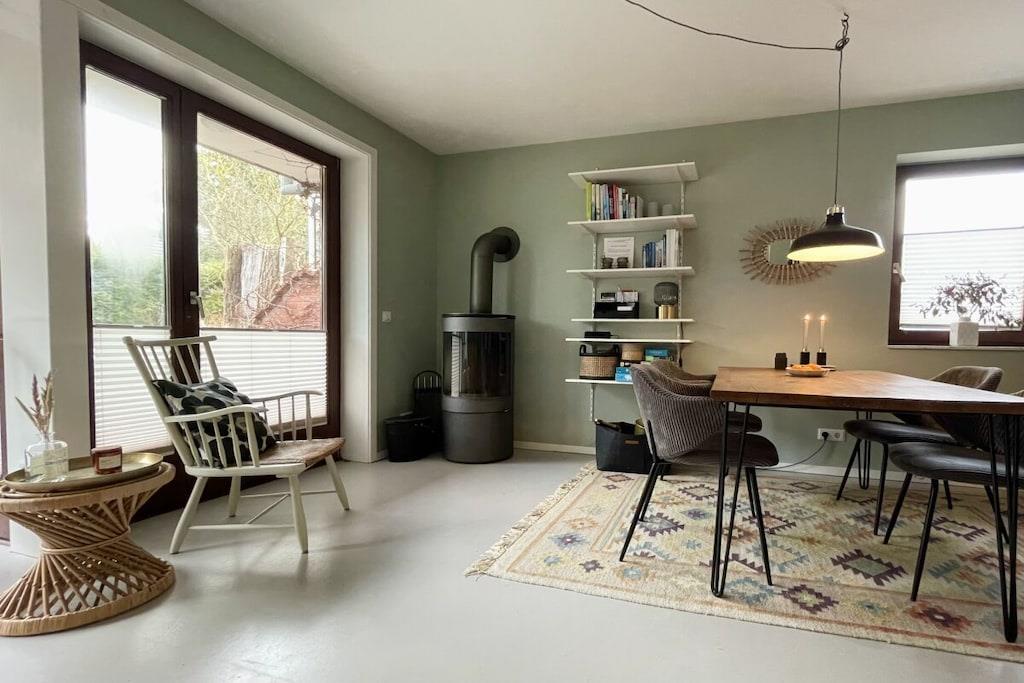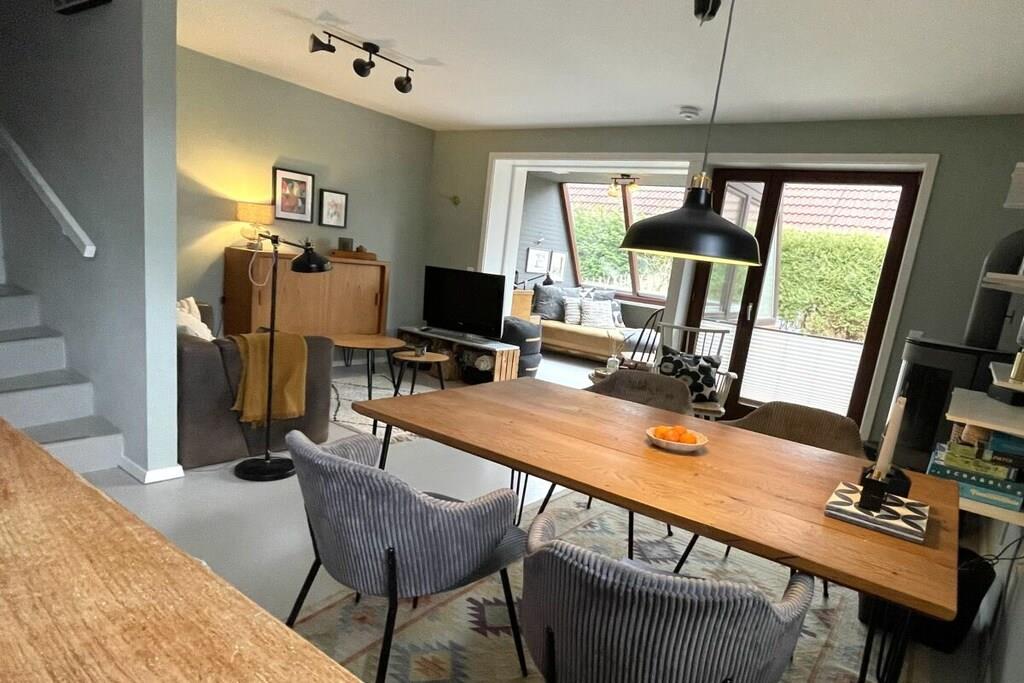 "Gönn dir mal 'ne Rauszeit!" – auf dieses Motto zu kommen, war für mich als Stadtmensch nicht schwer. Einen krasseren Gegensatz zum Trubel der Großstadt kann man sich kaum vorstellen. Das Haus erstreckt sich über drei Etagen (ca. 73 qm) und verfügt über eine Terrasse mit kleinem Gartenanteil sowie über einen Balkon (alle in Südausrichtung). Im Erdgeschoss befinden sich ein kleines Gäste-WC, eine kleine, voll eingerichtete Küche und ein großzügiger Wohn-Ess-Bereich. An diesen schließt sich eines der Highlights an: ein Wintergarten, der bei Sonnenschein lichtdurchflutet ist und bei Schietwetter zum Kuscheln und Lesen einlädt. Eine Etage höher finden sich ein modernes Bad mit geräumiger Dusche, ein großes Schlafzimmer mit Doppelbett und begehbarem Kleiderschrank sowie ein kleinerer Raum, der sowohl Arbeitszimmer als auch zweites Schlafzimmer ist. Der ausgebaute Dachboden eignet sich perfekt zum Spielen für Kinder, aber auch als Rückzugsort für Erwachsene. Zum Haus gehört noch eine eigene Garage, die nicht mehr zum Abstellen von PKW dient, sondern als sicherer und trockener Unterstand für Fahrräder. Einbauküche mit Elektroherd (vier Kochfelder), Kühlschrank, Spülmaschine und Mikrowelle. Außerdem Toaster, Espressokocher und eine hochwertige Kaffeemaschine sowie eine elektrische Kaffeemühle. Essbereich mit großem Esstisch und vier Stühlen sowie zwei Kinderhochstühlen, praktische Durchreiche zur Küche. Großes Wandregal zum Verstauen von Spielen, Büchern etc. Im Wohnbereich Zweiersofa, Sessel, Abstelltische. Wintergarten mit antikem Daybed, Bücherregal mit Lesestoff und Informationen zu Aktivitäten in der Umgebung. Plattenspieler mit integrierter CD- und Kassetten-Funktion. Dazu passend sind einige Schallplatten, Cds und Kassetten vorhanden. Außerdem gibt es eine Bluetooth-Box. TV-Empfang über Entertain (IP-Fernsehen der Telekom). Zahlreiche öffentlich-rechtliche und private TV-Sender (davon etliche in HD), Festplattenrekorder mit Aufnahme- und Time-Shift-Funktion, kostenfreier Zugang zu diversen Mediatheken, YouTube, Internet-Radio. Bisher kein DVD-Player, Gäste mit Netflix- oder Amazon Prime-Abo können sich jedoch mit ihren eigenen Zugangsdaten einloggen. Kostenfreies WLAN, schneller Internet-Zugang (50 Mbit/s). Schnurloses Telefon, eingehende Anrufe, Orts- und Ferngespräche sowie Gespräche zu deutschen Mobilfunknetzen sind kostenfrei. Terrasse mit Esstisch und Stühlen für vier Personen sowie zwei Sonnenliegen. Tageslichtbad im Obergeschoss mit Föhn. Großes Schlafzimmer mit Doppelbett, begehbarem Kleiderschrank und Fernseher. Kleines Schlaf- und Arbeitszimmer mit Schreibtisch und Ausziehbett für eine oder zwei Personen (als Doppelbett). Diverse Einbauschränke bieten auch hier genügend Stauraum. Ausgebauter Dachboden mit Sitzsack, Tipi, Spielzeug, Kinderbüchern und CDs. Der Außenbereich (Terrasse, Gartenanteil und Balkon) bietet gemütliche Sitz-, Ess- und Liegemöglichkeiten.