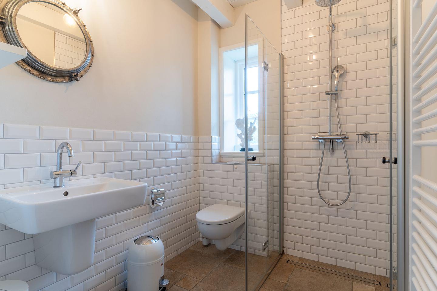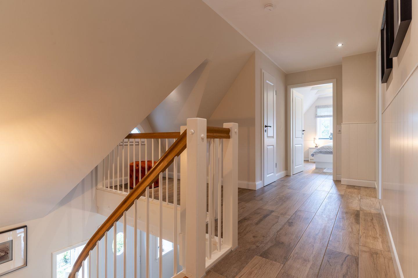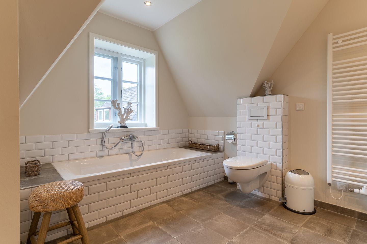 Eine Holztreppe führt Sie ins Obergeschoss, wo zwei weitere stilvoll eingerichtete Schlafzimmer mit komfortablen Doppelbetten (1x 200 x 210 cm + TV und 1x 160 x 200 cm) und ein weiteres Schlafzimmer mit einem Einzelbett (1x 100 x 200 cm) auf Sie warten. Ein geräumiges Badezimmer mit Dusche und Badewanne sorgt für zusätzlichen Komfort.