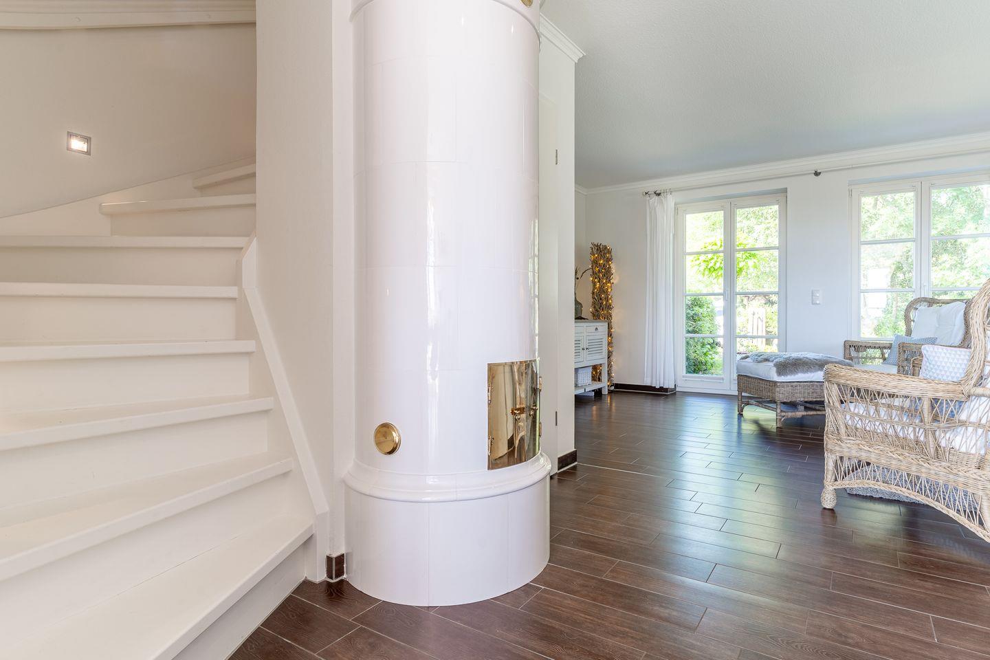 Im Erdgeschoss erwartet Sie ein lichtdurchflutetes Wohnzimmer mit einem freien Blick über die Felder und einem gemütlichen schwedischen Kachelofen. Die offene Küche lädt mit einem Essbereich zum gemeinsamen Kochen ein. Ein Duschbad mit WC befindet sich ebenfalls im Erdgeschoss.