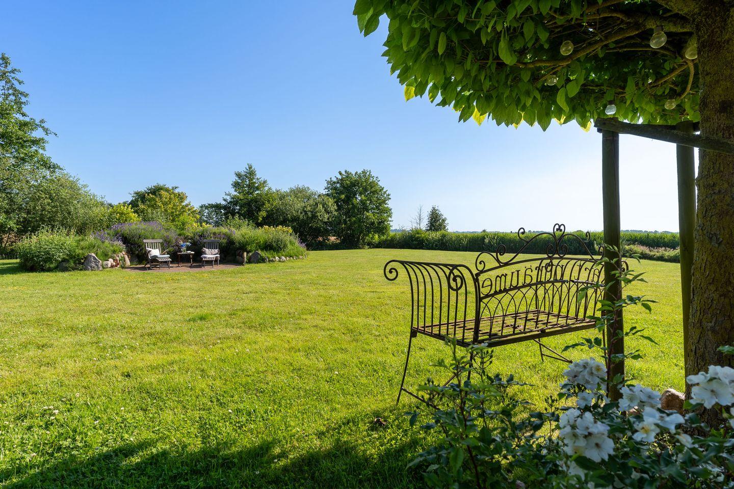 Im Ferienhaus ist die Mitnahme von maximal einem Hund gestattet. Der Garten wird durch zwei Wasserläufe am Ende des Grundstücks begrenzt.
