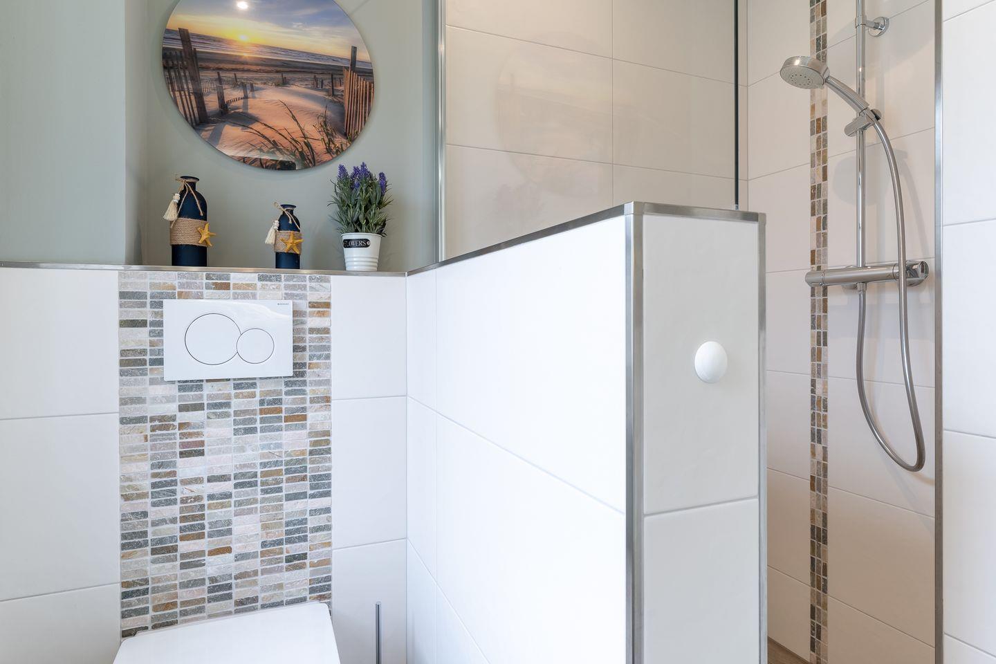 Von dort gelangen Sie in ein weiteres Badezimmer, das mit Waschbecken, Toilette und bodengleicher Dusche ausgestattet ist. Ebenfalls finden Sie dort den hauseigenen Waschtrockner.