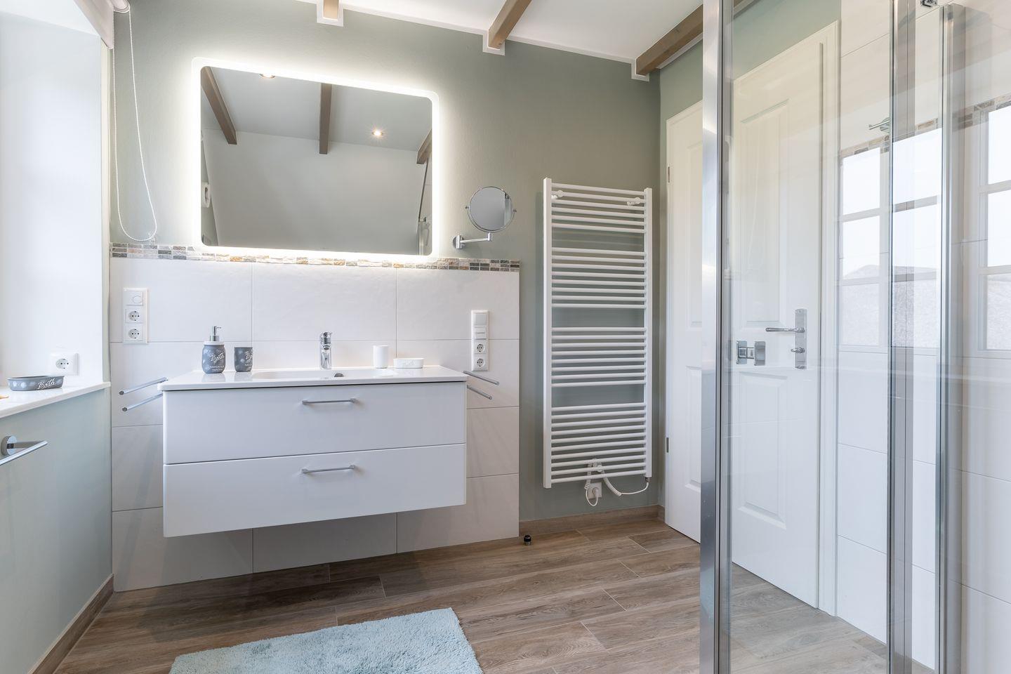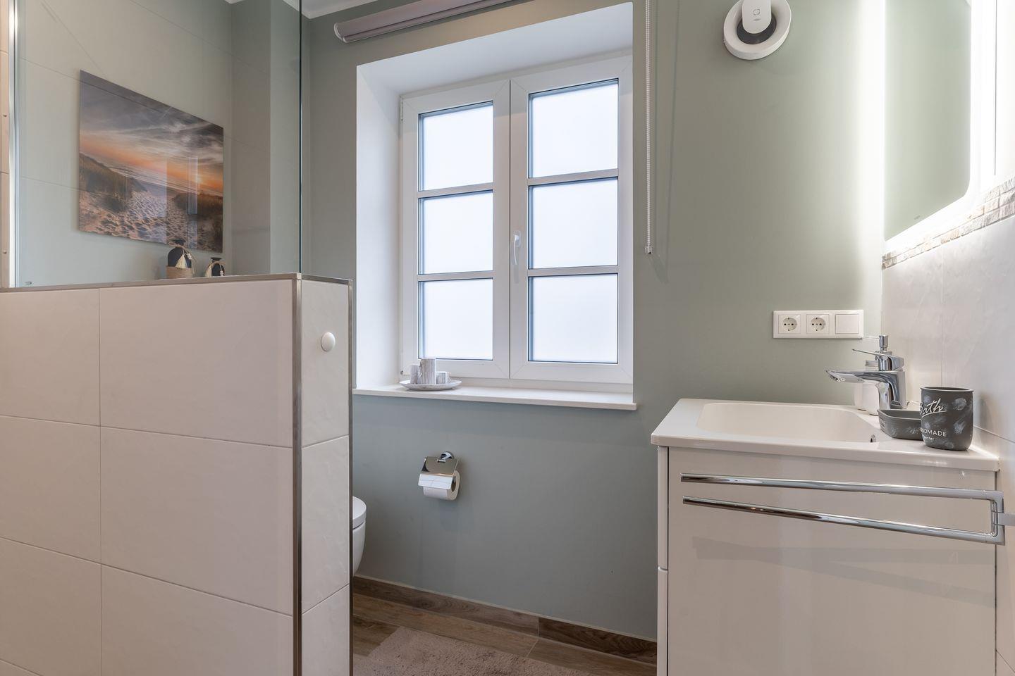 Die Badezimmer sind mit Schminkspiegel und Haartrockner ausgestattet. Für vorgewärmte und schnell trocknende Handtücher sorgt ein elektronischer Handtuchtrockner. Pro Doppelhaushälfte ist weiterhin eine Personenwaage vorhanden. Das große Badezimmer verfügt ebenso über eine ALEXA-Einheit. Schlaf- sowie Wohnzimmer sind mit Plissees bzw. Vorhängen ausgestattet, die eine komplette Verdunklung ermöglichen. Weiterhin finden Sie in Wohn- und Schlafzimmern mit Fliegengittern versehene Fenster vor.