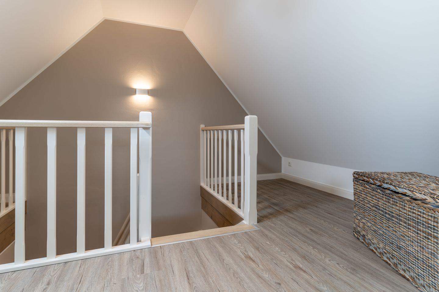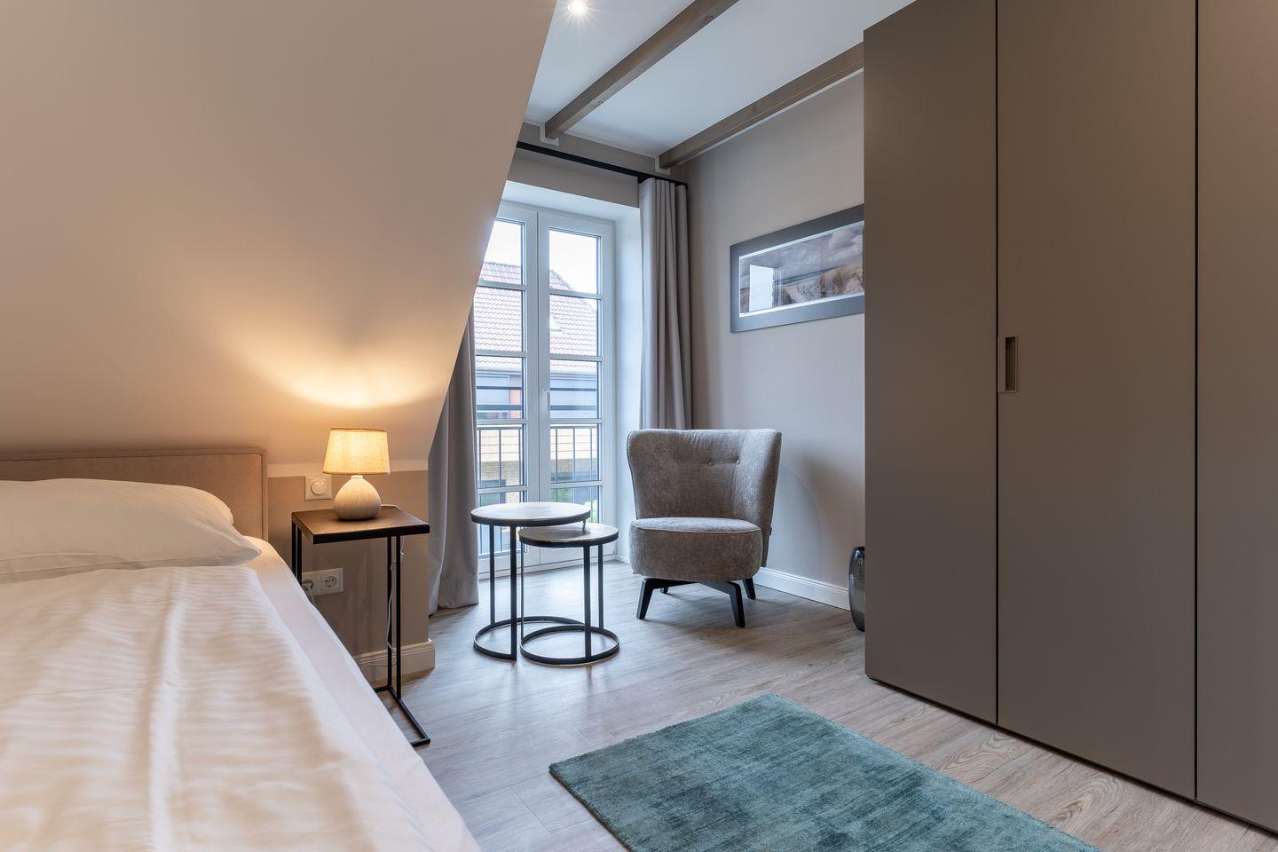 Das Obergeschoss bietet zwei weitere Schlafzimmer, eins davon mit eigenen TV. Das erste Schlafzimmer verfügt über ein komfortables 180x200cm Boxspringdoppelbett sowie einen Kleiderschrank und Sessel.