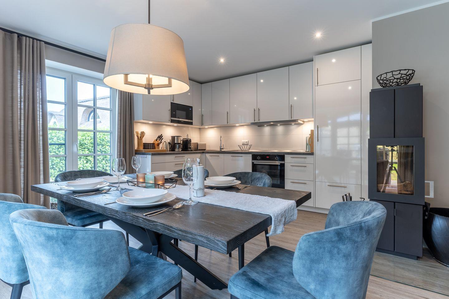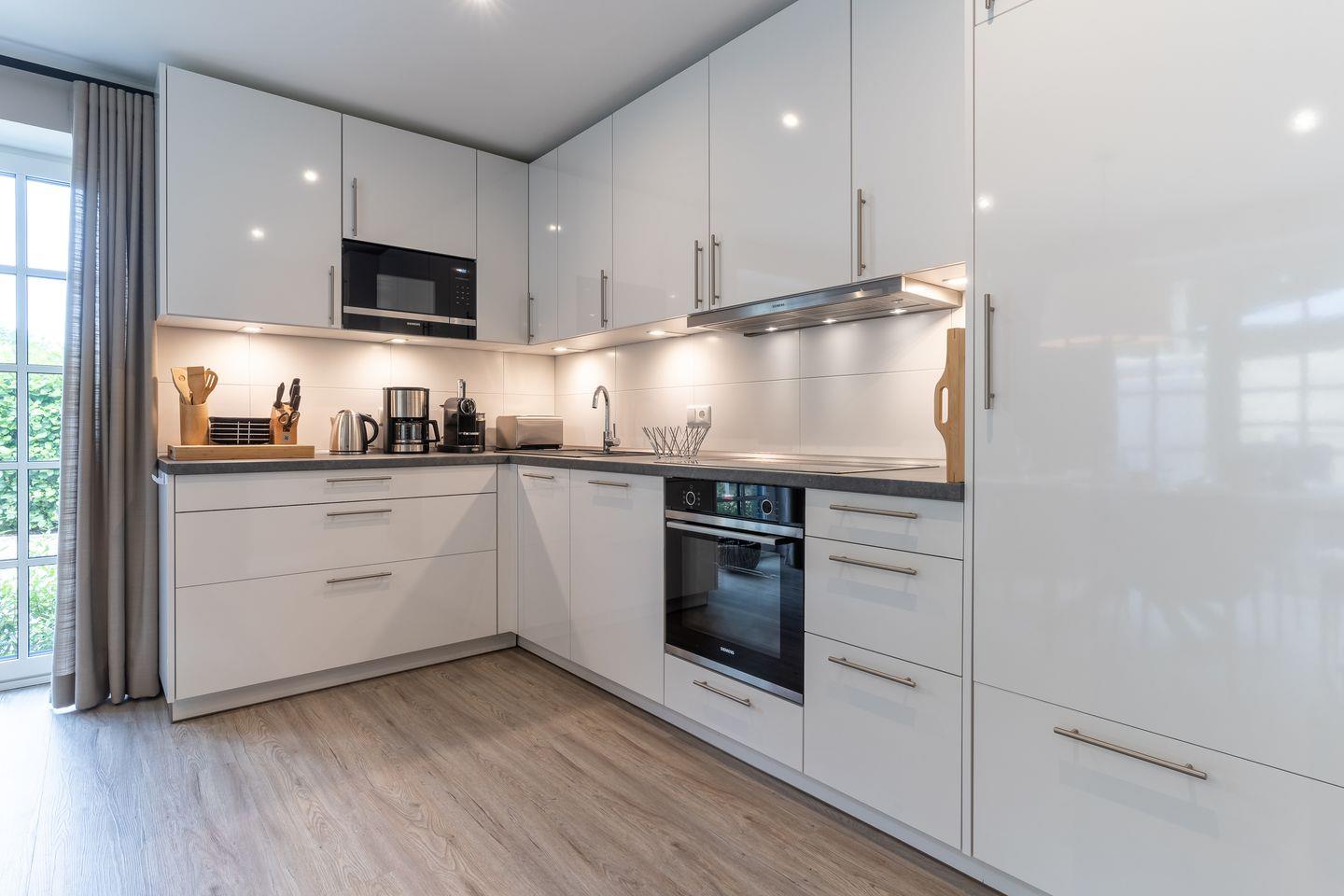 Die Küche wartet mit modernster Elektronik, darunter Geschirrspüler, Herd, Induktionskochfeld und Mikrowelle auf. Die hochwertige und umfangreiche Ausstattung an Geschirr, Besteck und Zubehör lässt keine Wünsche offen.