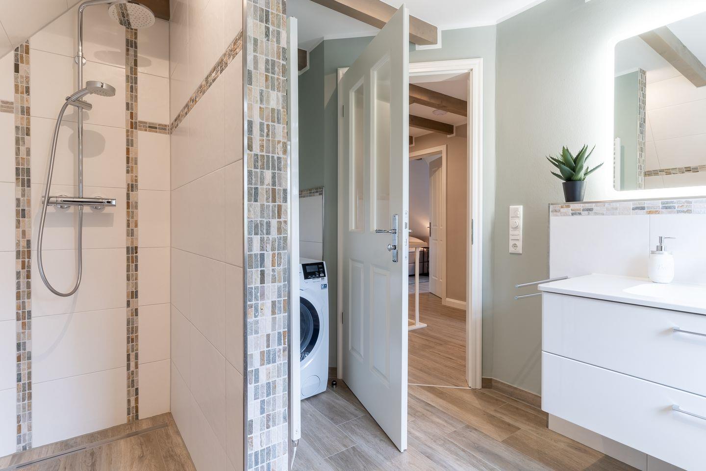 Im großen Badezimmer des Summerdiek 10 finden Sie neben dem Waschbecken auch die Sauna des Hauses, eine Badewanne sowie bodengleiche Dusche und Toilette. Im zweiten Badezimmer befinden sich neben dem Waschbecken noch eine bodengleiche Dusche, die Toilette und der hauseigene Waschtrockner.