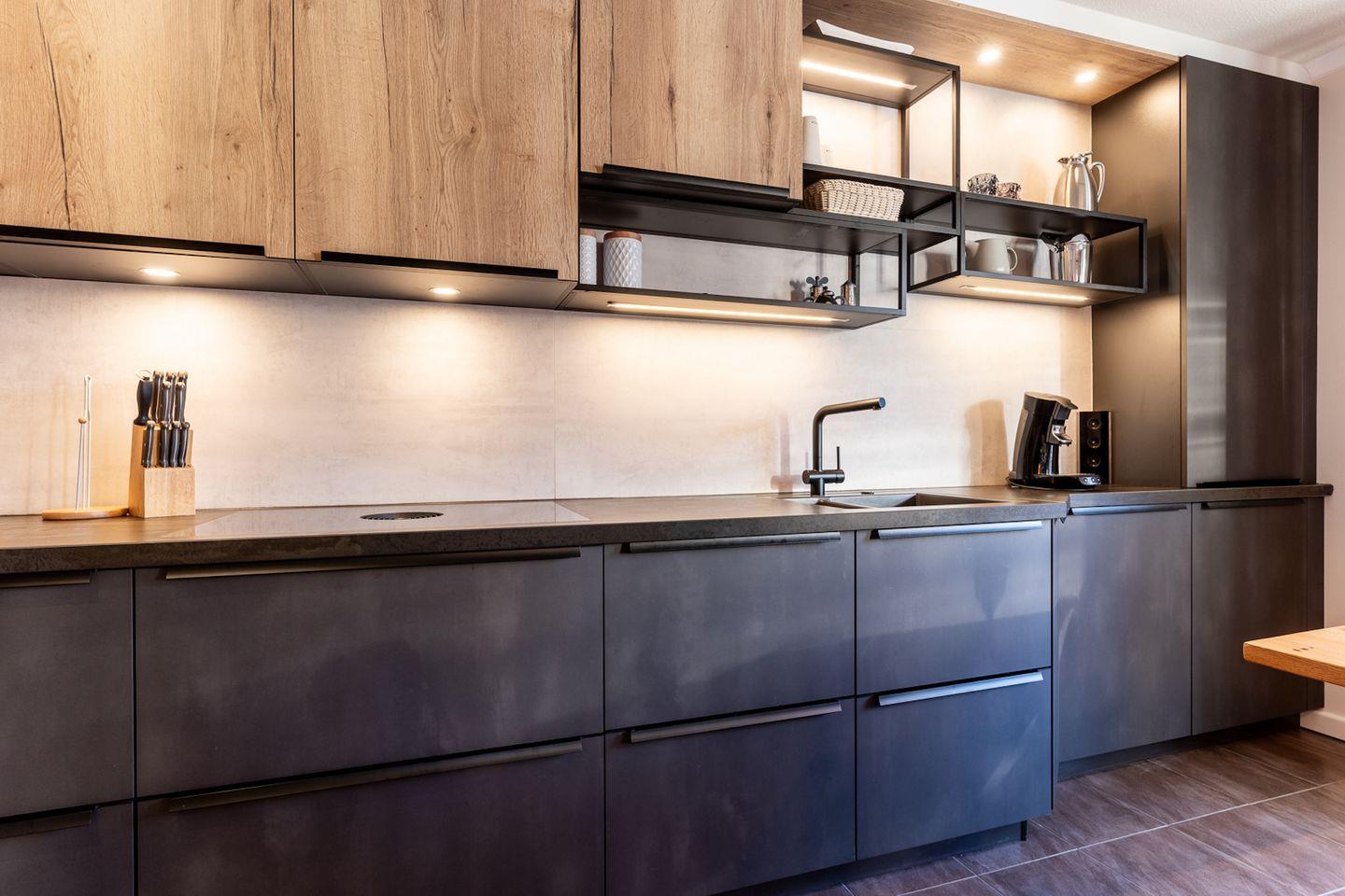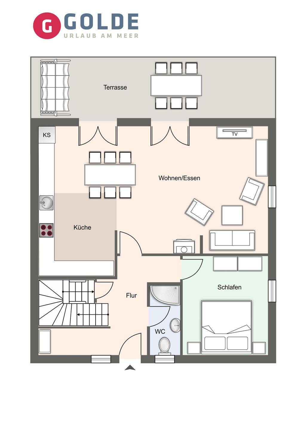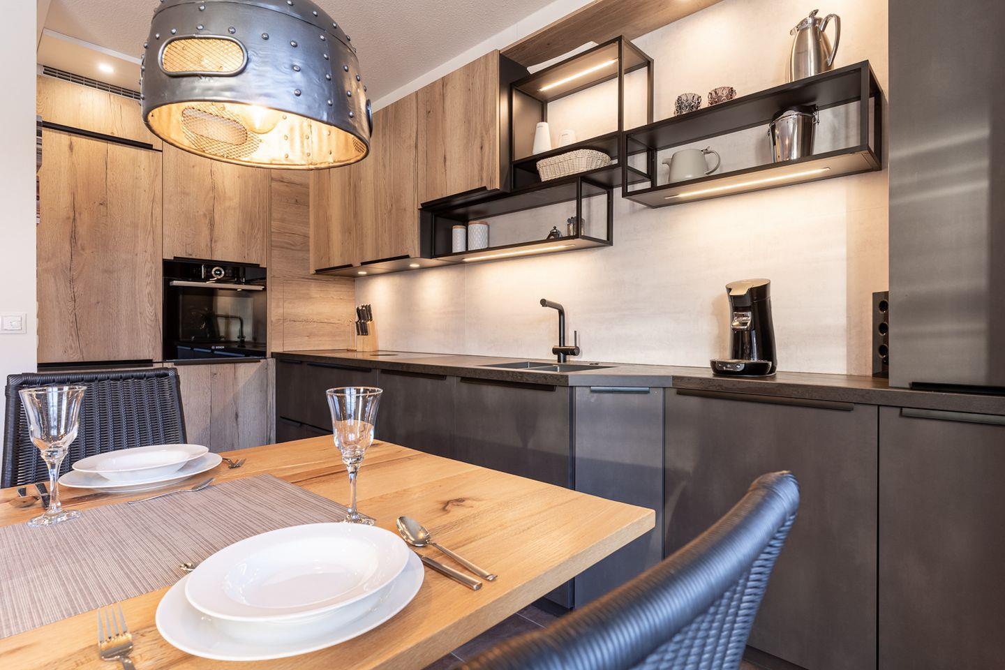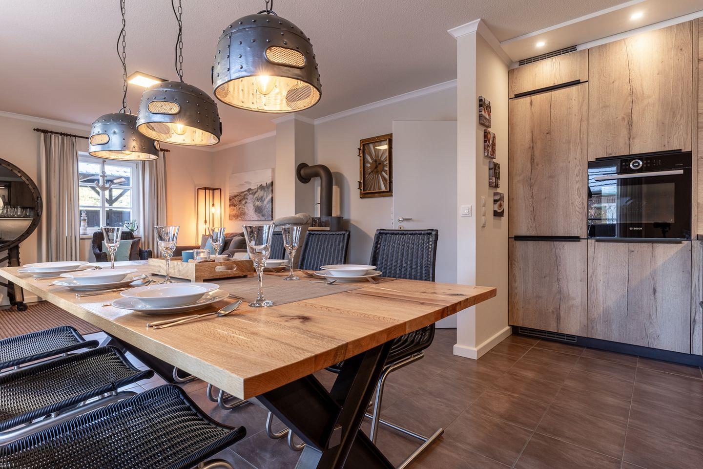 Im Erdgeschoss befindet sich der Wohnraum mit einer offenen Küche und einem gemütlichen Essbereich. Die Küche ist mit hochwertigen Geräten voll ausgestattet.