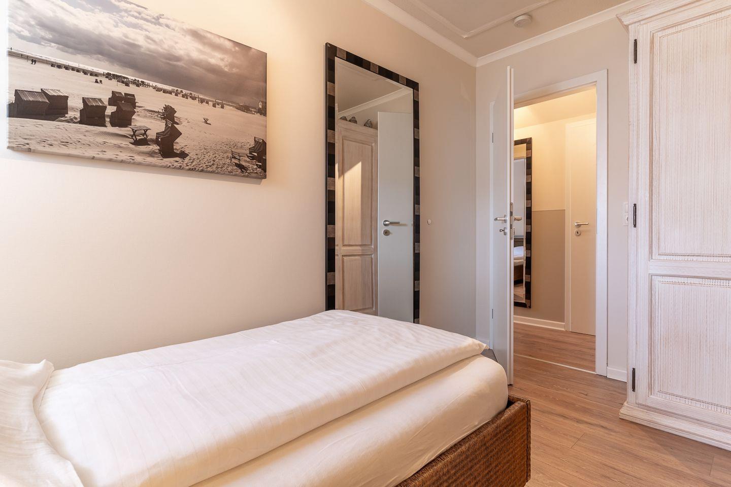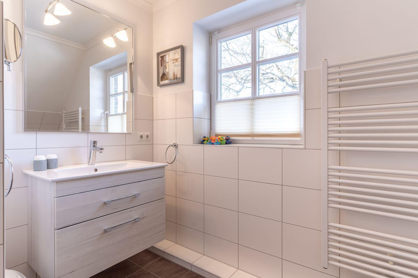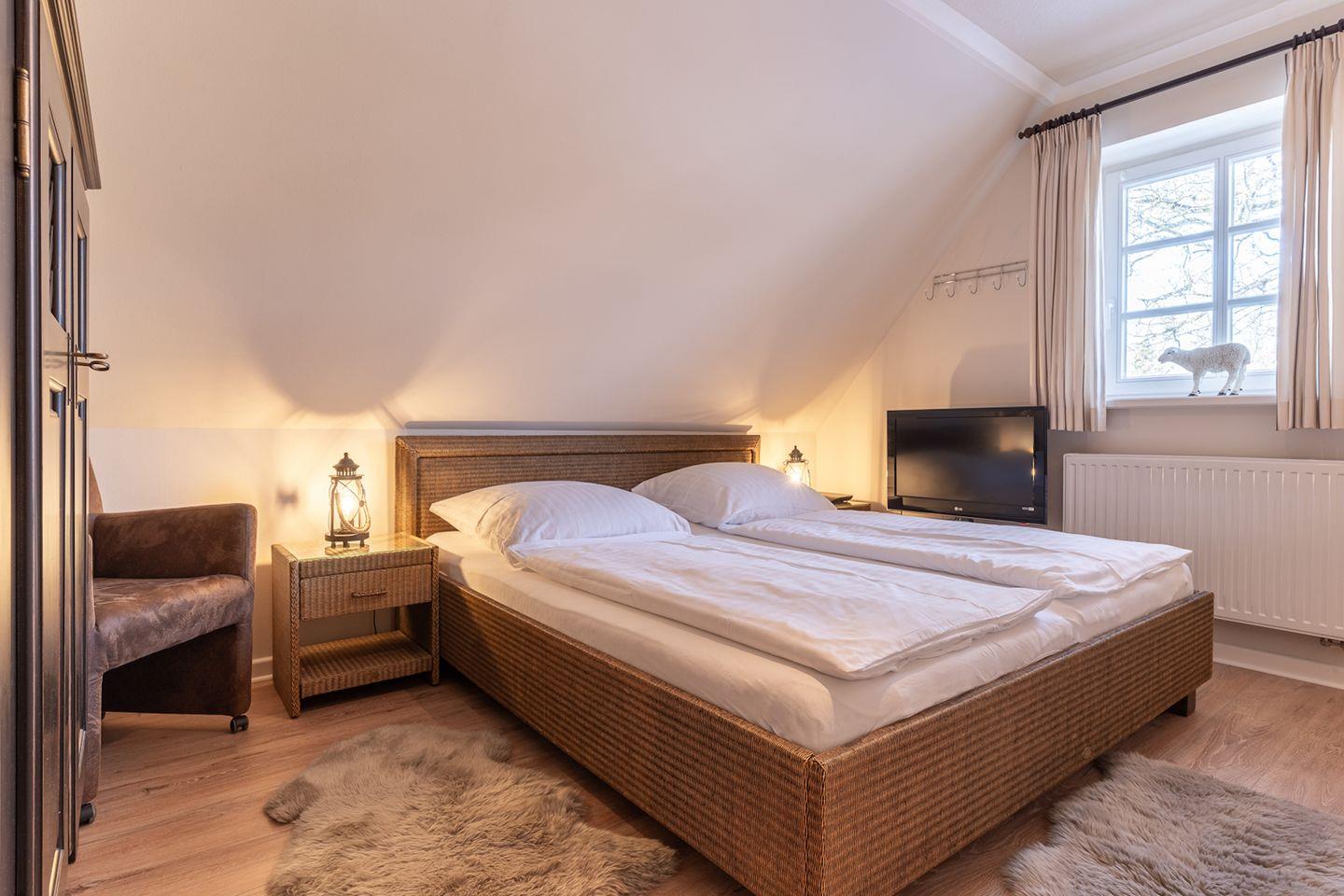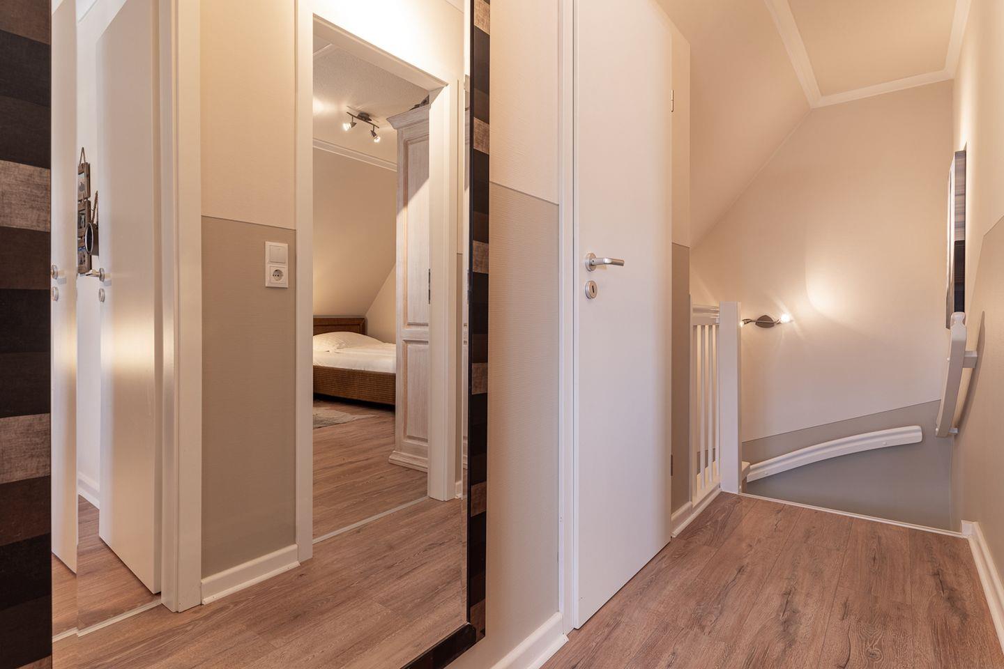 Über eine Holztreppe im Flur gelangt man in das Obergeschoss mit zwei Schlafzimmern. Eines verfügt über ein 180er Bett mit TV und das andere über 2 x 90er Einzelbetten. Außerdem ist im Obergeschoss ein Duschbad.