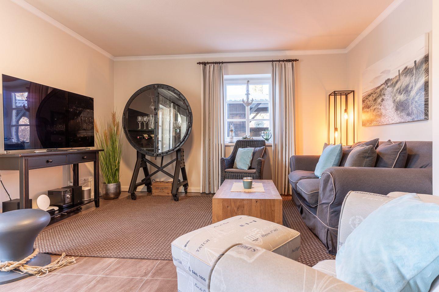 Einen wunderschönen Garten mit heimischen Pflanzen erreichen Sie direkt vom Wohnraum. Hier befindet sich eine Terrasse mit Gartenmöbel und ein Strandkorb.