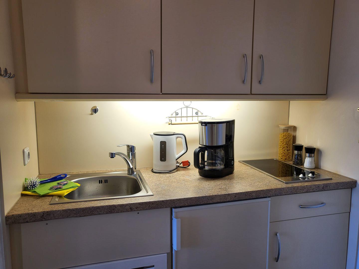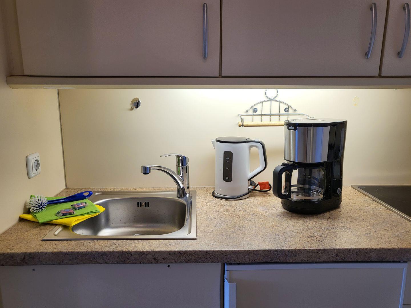 Die Küche bietet neben Cerankochfeld und Geschirrspüler auch eine Mikrowelle sowie Kaffeemaschine, Toaster und Wasserkocher.
