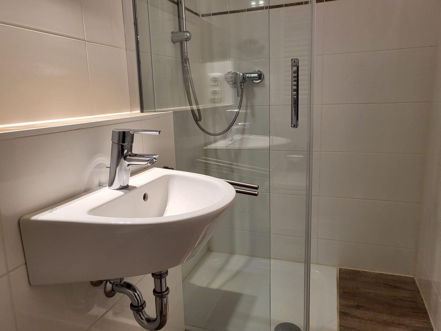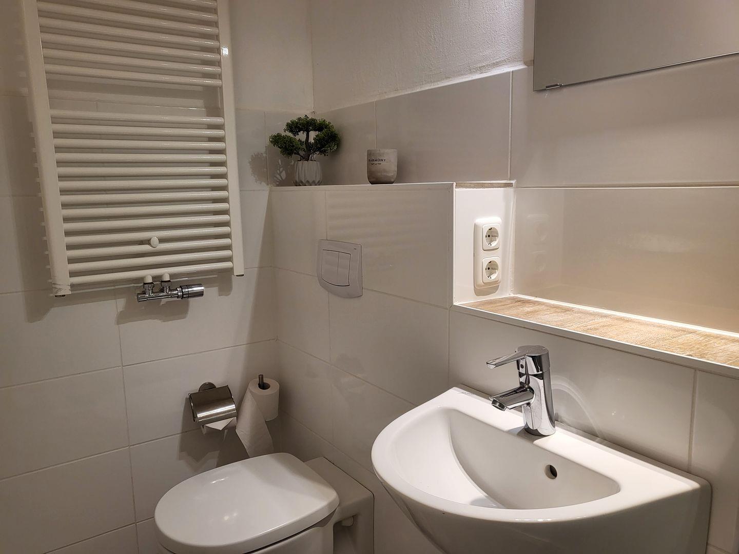 Zur Ferienwohnung gehört ein modernes Badezimmer mit Dusche und WC.