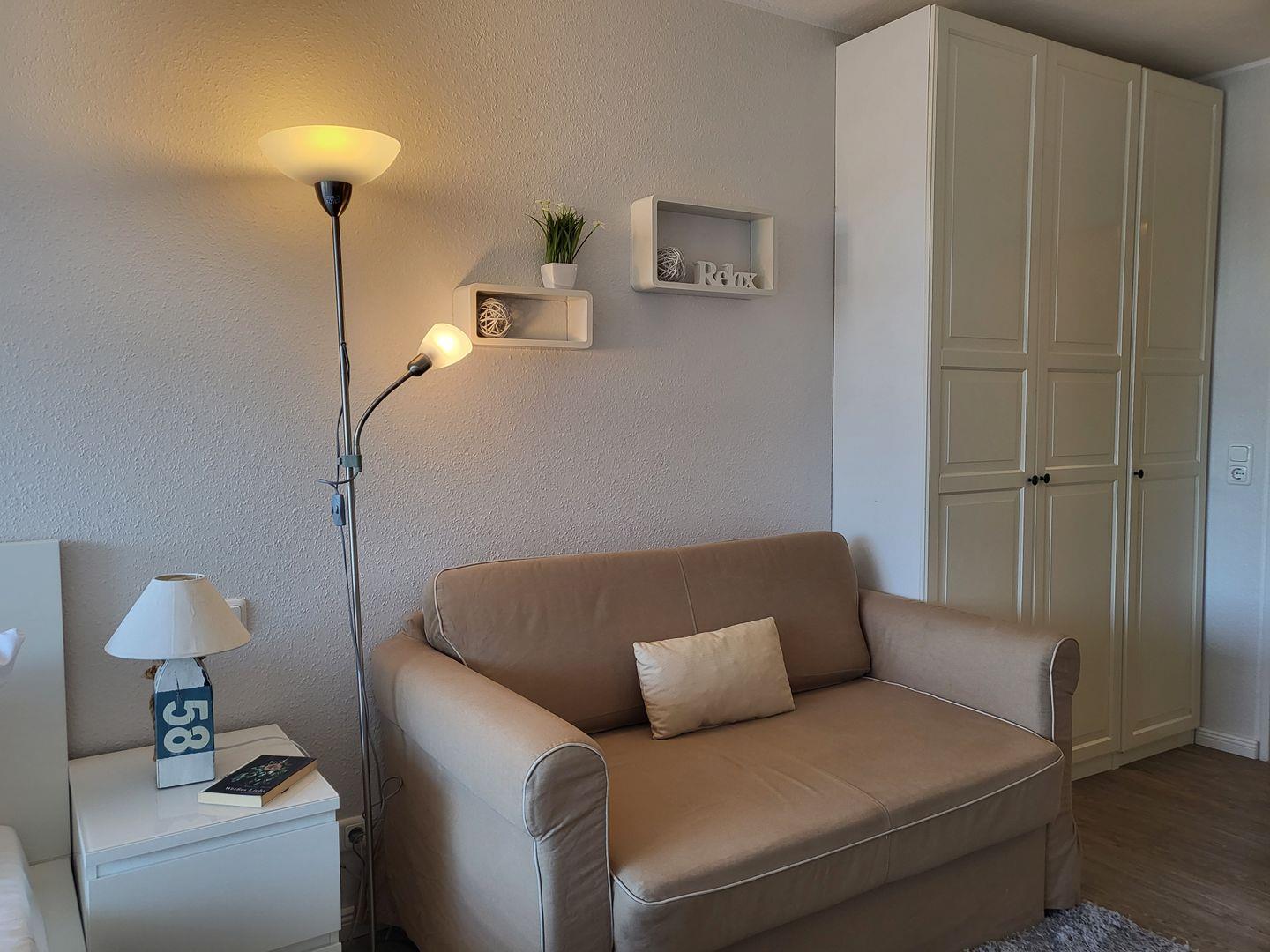 1 Zimmer Apartment mit Balkon, Wohnschlafraum mit Doppelbett und Zweisitzer Sofa, Esstisch, TV WLAN, Küchenzeile, Duschbad mit WC, Tiefgaragenstellplatz, Fahrradkeller,Nichtraucher, keine Tierhaltung