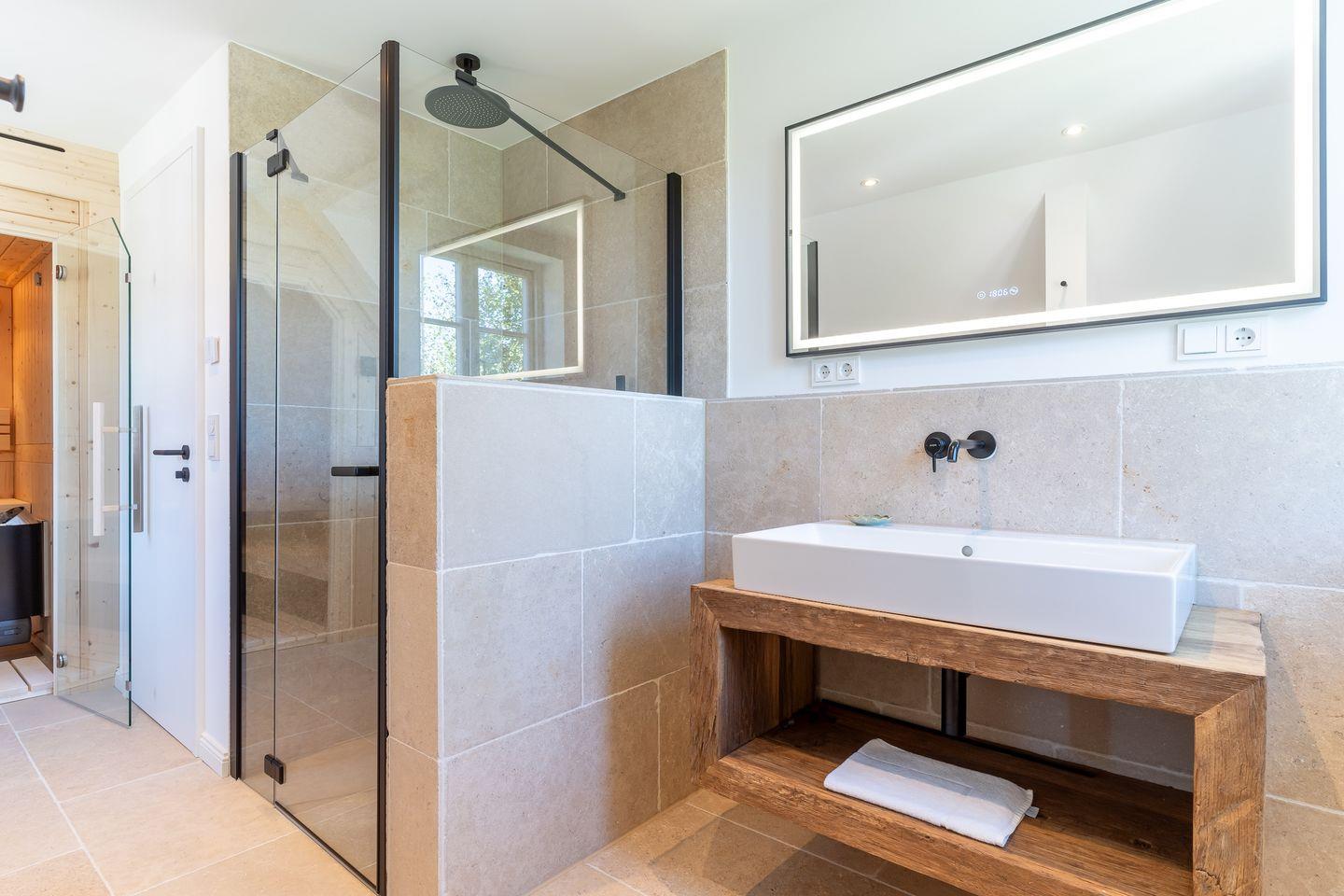 Ein traumhaftes, vollausgestattetes Badezimmer im OG, mit einer Dusche, einer freistehenden Badewanne und einer Sauna runden das hochwertige Hauskonzept ab und lassen keine Wünsche offen.