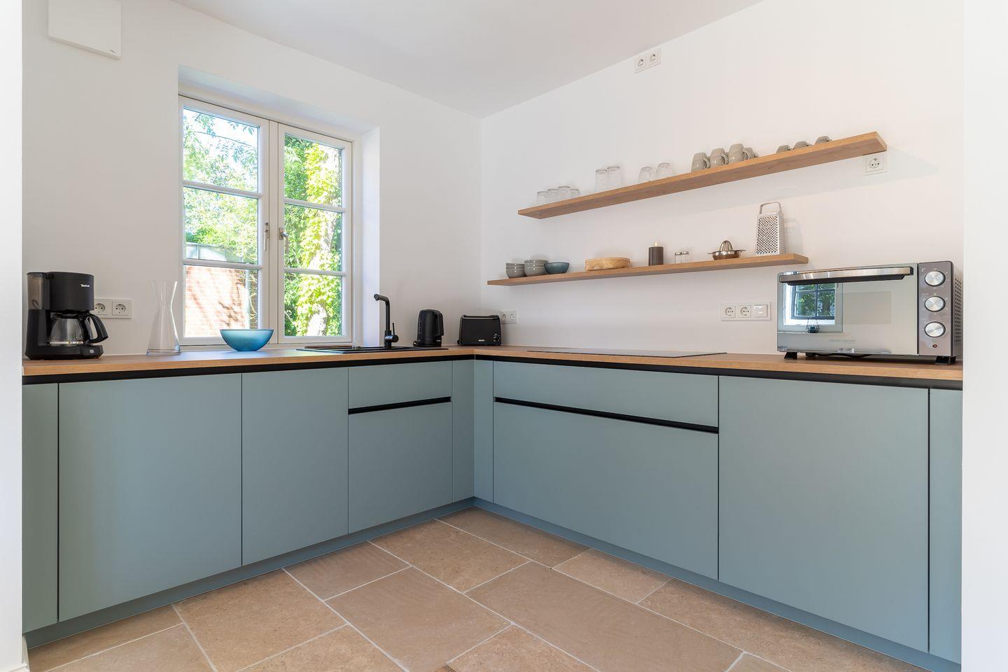Die Küche verfügt über hochwertige Elektrogeräte, einer Spülmaschine, kleinen Backofen mit Mikrowelle und bietet genügend Platz zum gemeinsamen Kochen.