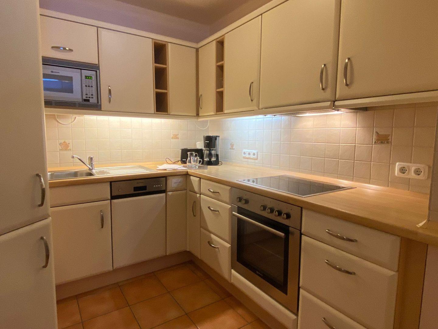 Die halboffene Küche ist komplett ausgestattet, von Kühlschrank mit Gefriermöglichkeit über 4-er Cerankochfeld, Backofen, Mikrowelle, Dunstabzug bis hin zum Geschirrspüler, für eine mühelose Selbstversorgung.
