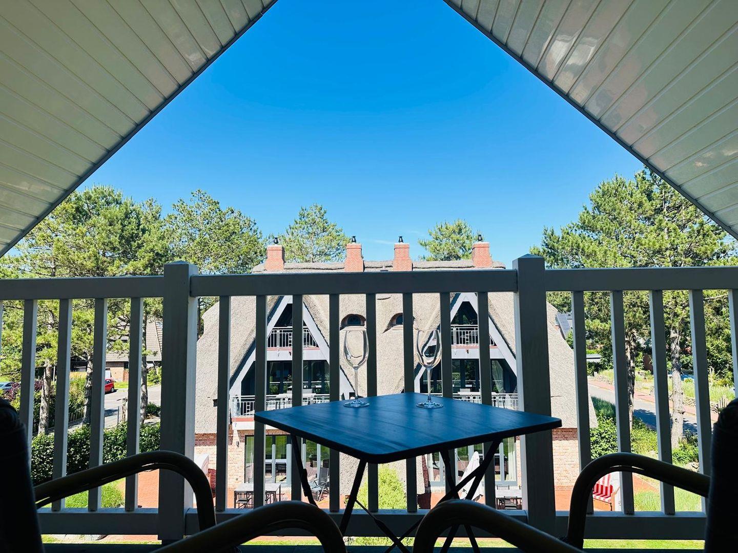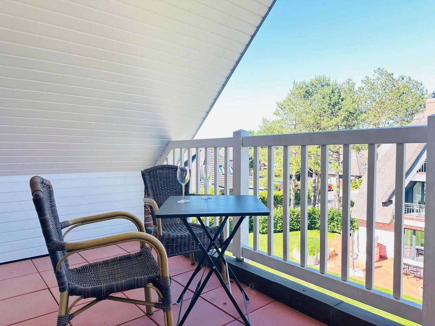 Genießen Sie entspannte Momente auf dem zum Garten ausgerichteten, möblierten Balkon mit Polsterauflagen und Sonnenschirm. Eine möblierte Loggia zur Straßenseite rundet das Angebot ab.