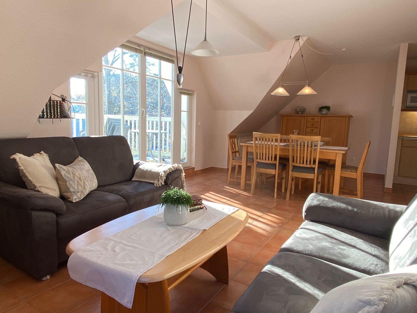Willkommen in unserer 4-Zimmer-Wohnung auf 110 qm im 1. OG und Dachgeschoss. Perfekt für 6 Personen. Gemütliche Sitzecke mit Ledergarnitur, voll ausgestattete halboffene Küche. Balkon und Loggia mit Gartenmöbeln. Drei Schlafzimmer mit Doppelbetten. Tageslichtbäder mit Dusche. Freier Zugang zum Hauswirtschaftsraum. Waschmaschine/Trockner gegen Gebühr. Fahrradraum vorhanden. Gekennzeichneter Stellplatz für Ihr Auto auf dem Grundstück. Ideal für einen komfortablen Aufenthalt.