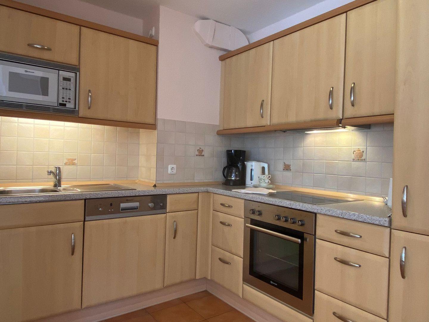 Die halboffene Küche ist komplett ausgestattet – von Kühlschrank mit Gefriermöglichkeit über 4-er Cerankochfeld, Backofen, Mikrowelle, Dunstabzug bis hin zum Geschirrspüler – für mühelose Selbstversorgung.