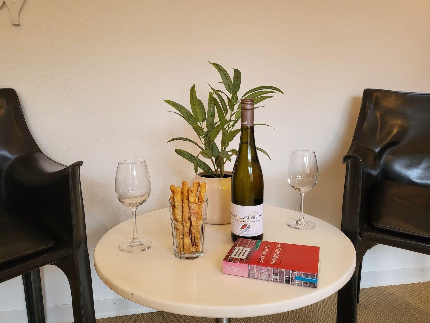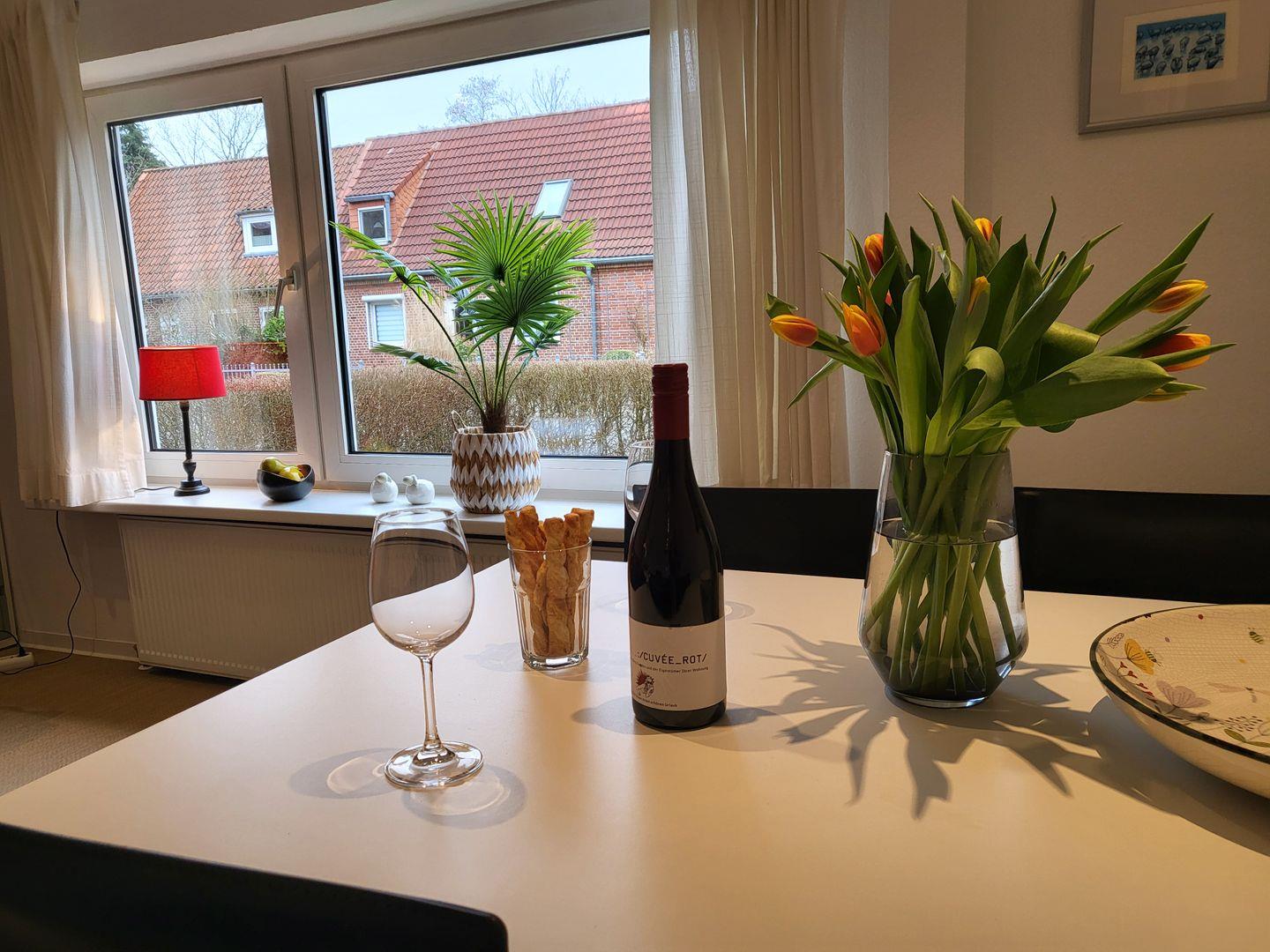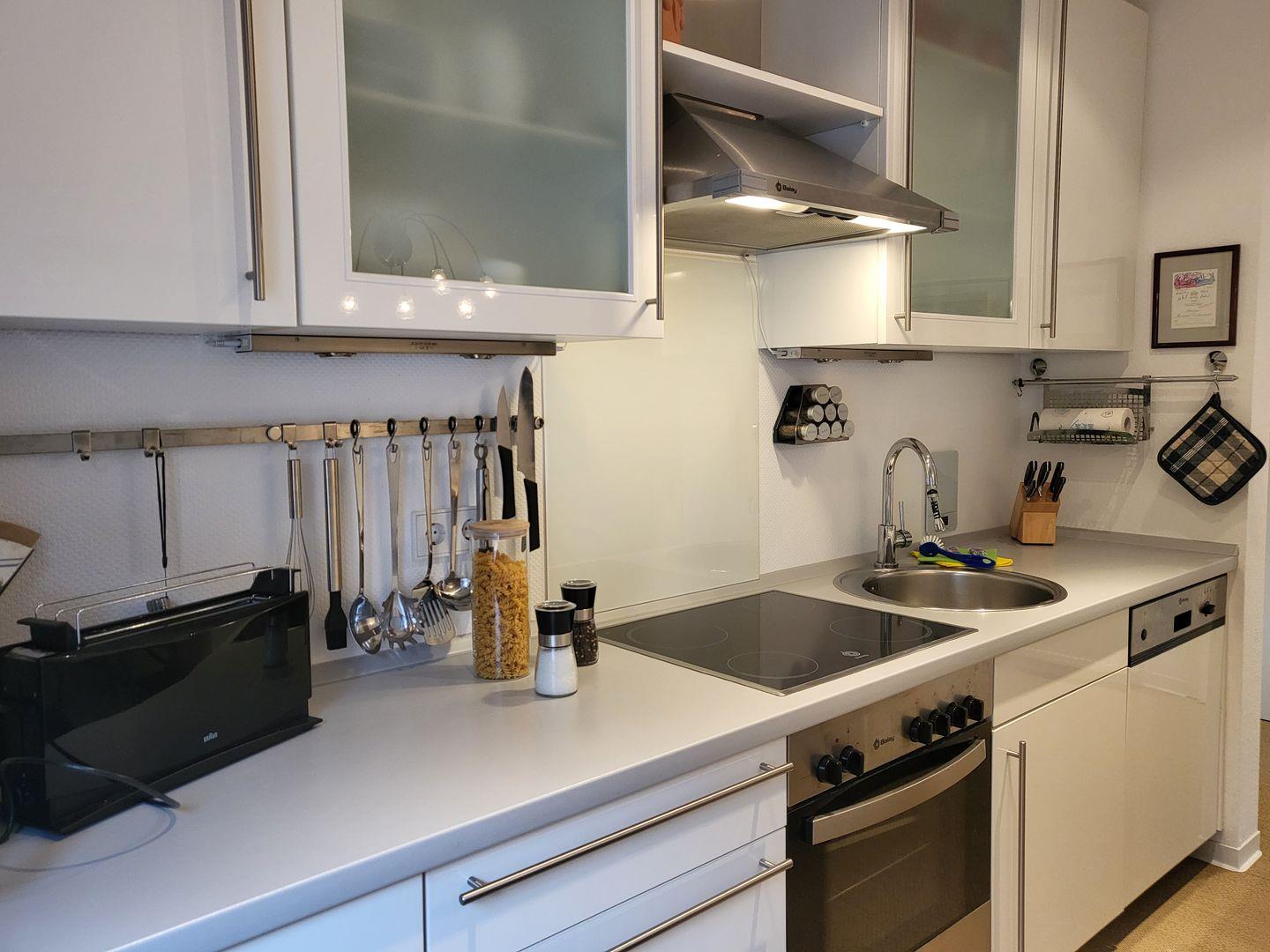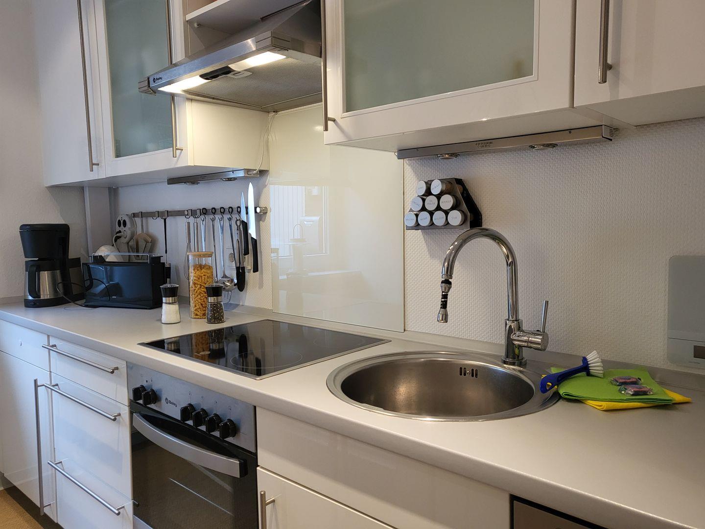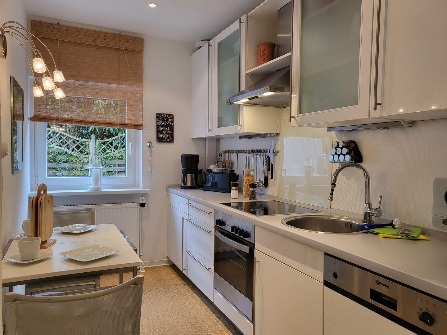 In der Küche steht ein Herd mit Backofen, Geschirrspüler und Kühlschrank zur Verfügung und ist auch sonst mit reichlich Geschirr und Gläsern ausgestattet.