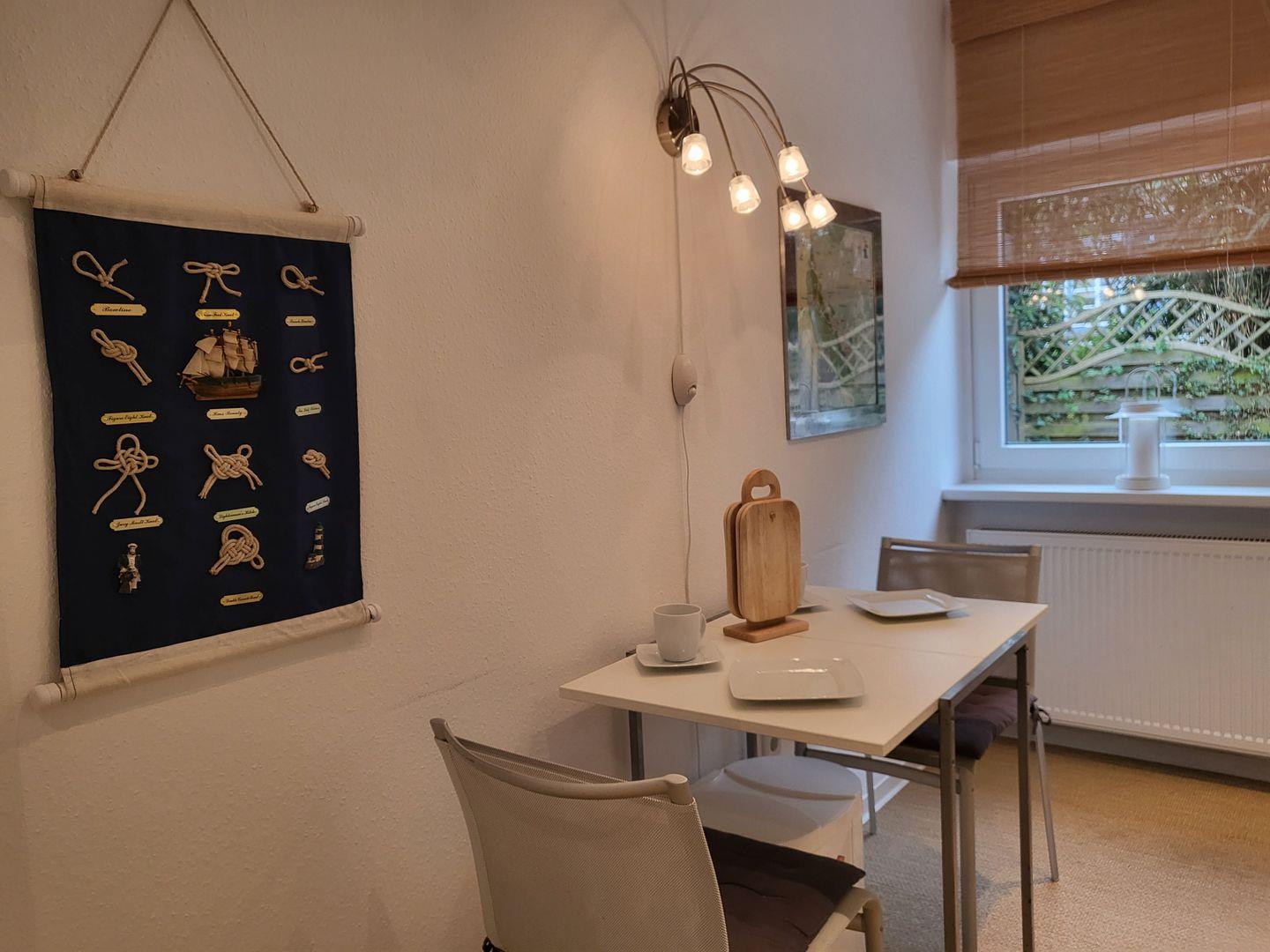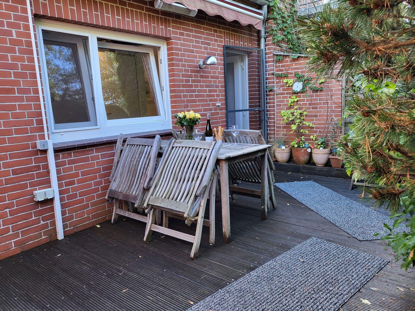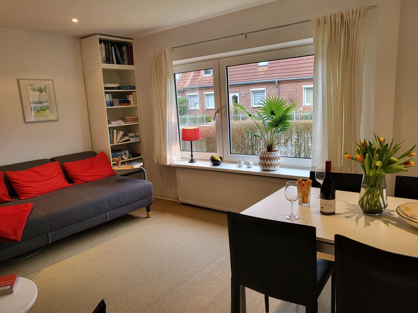 2-Zimmerwohnung im Erdgeschoß mit Terrasse, Schlafzimmer mit kleinem Doppelbett, Küchenzeile, Wohnzimmer mit Esstisch und einem Schlafsofa, keine Tiere, Nichtraucher, PKW-Stellplatz und Fahrradabstellmögichkeit in der Garage